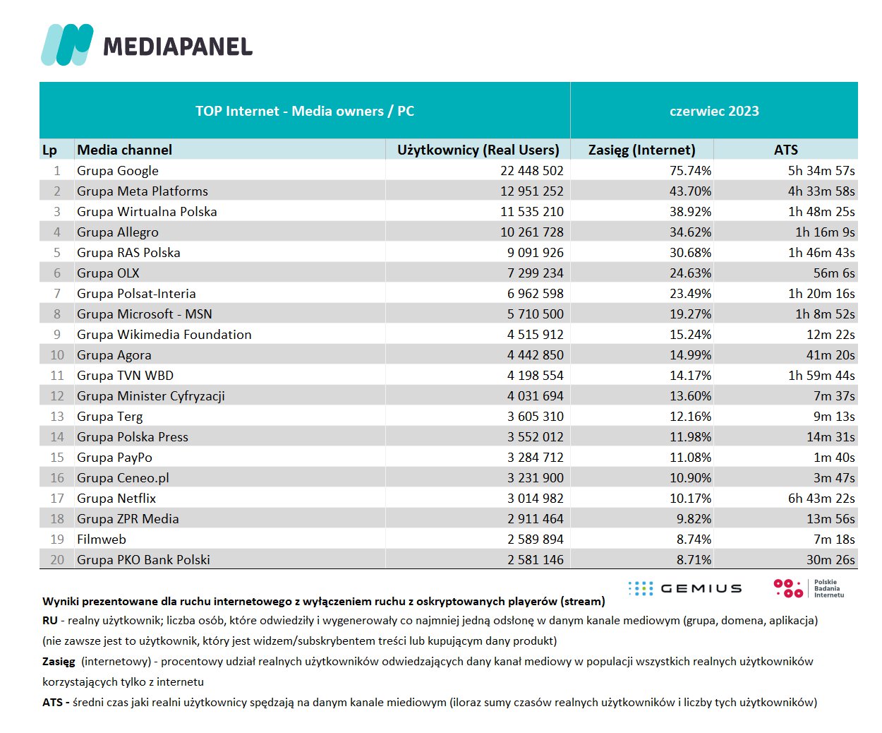 Mediapanel prezentuje szczegółowe miesięczne dane pochodzące z badania internetu: rankingi wydawców i witryn internetowych oraz aplikacji. Publikuje także zestawienie audytowanych playerów audio i wideo – ich wyniki pokazano w agregacji do grup mediowych, biorących udział w badaniu.