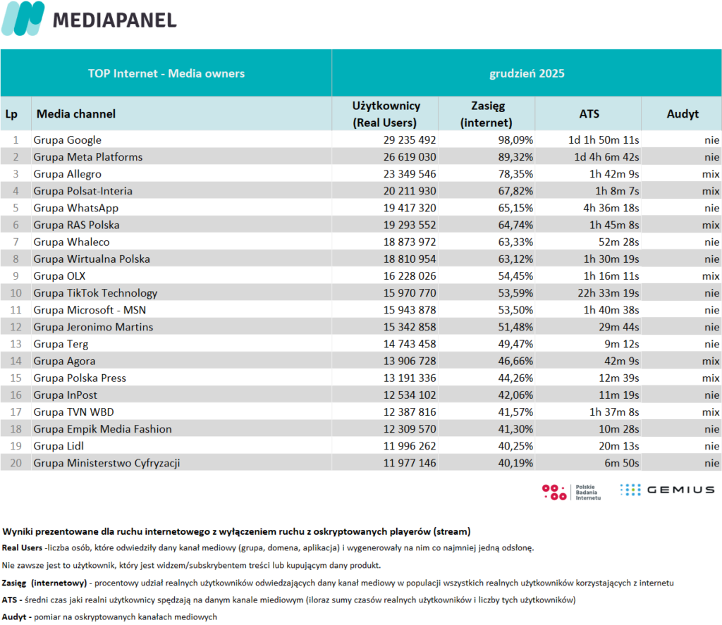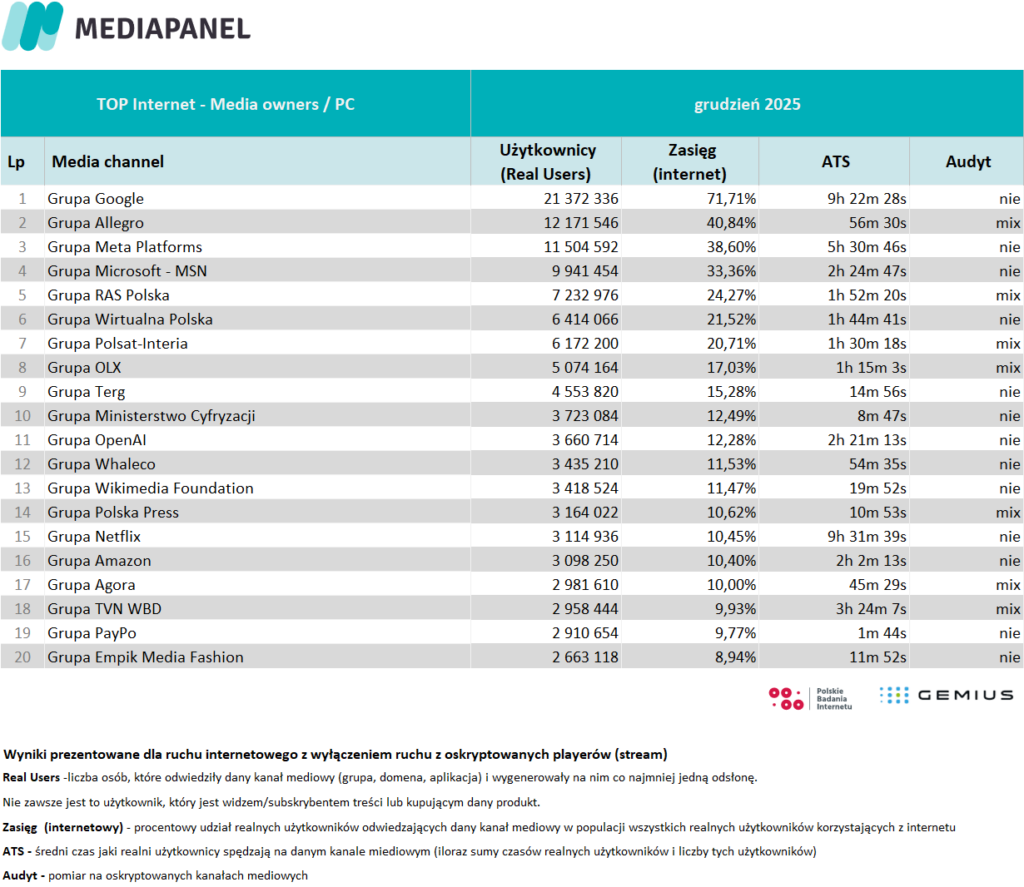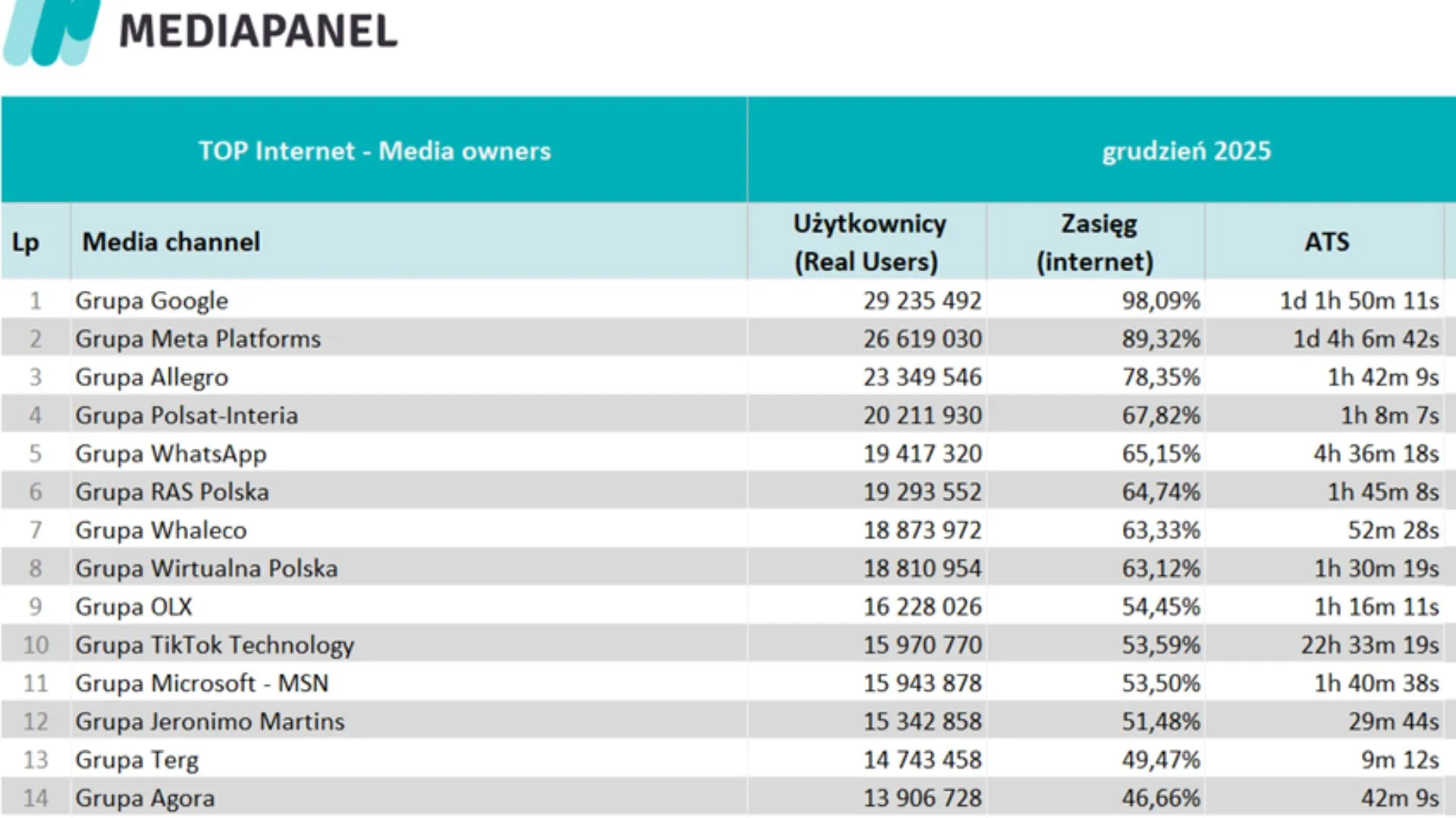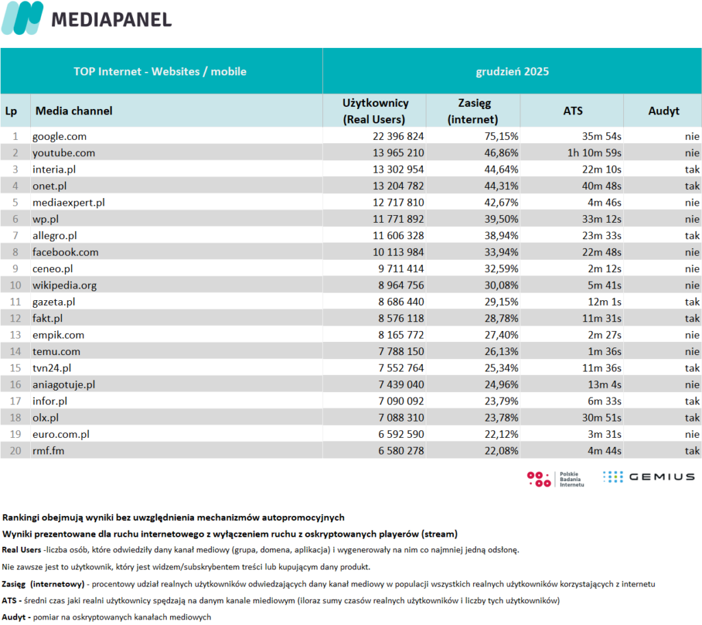 W grudniu 2025 roku najpopularniejszym wydawcą internetowym była Grupa Google. Witrynami internetowymi, z których najczęściej korzystaliśmy, były natomiast: google.com, youtube.com i facebook.com. Na miano najpopularniejszych aplikacji zasłużyły Allegro, Jakdojade i Nowa Poczta Interia.