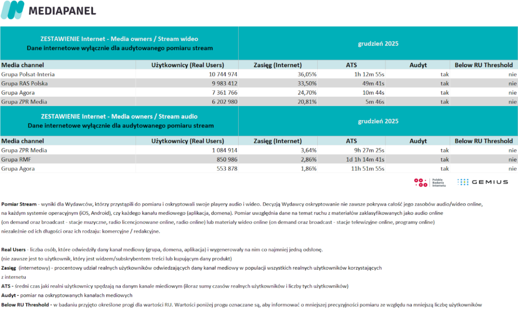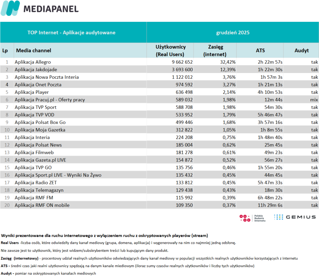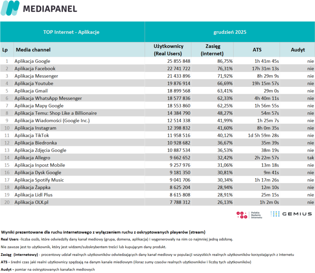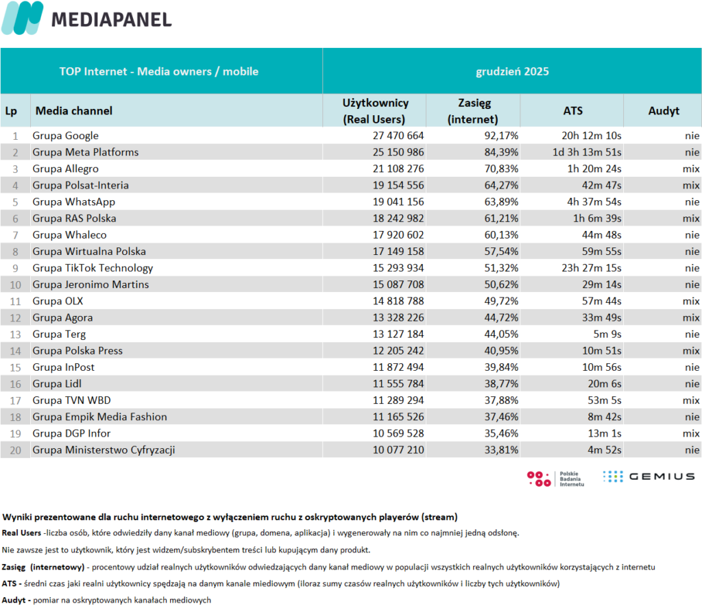 W grudniu 2025 roku najpopularniejszym wydawcą internetowym była Grupa Google. Witrynami internetowymi, z których najczęściej korzystaliśmy, były natomiast: google.com, youtube.com i facebook.com. Na miano najpopularniejszych aplikacji zasłużyły Allegro, Jakdojade i Nowa Poczta Interia.