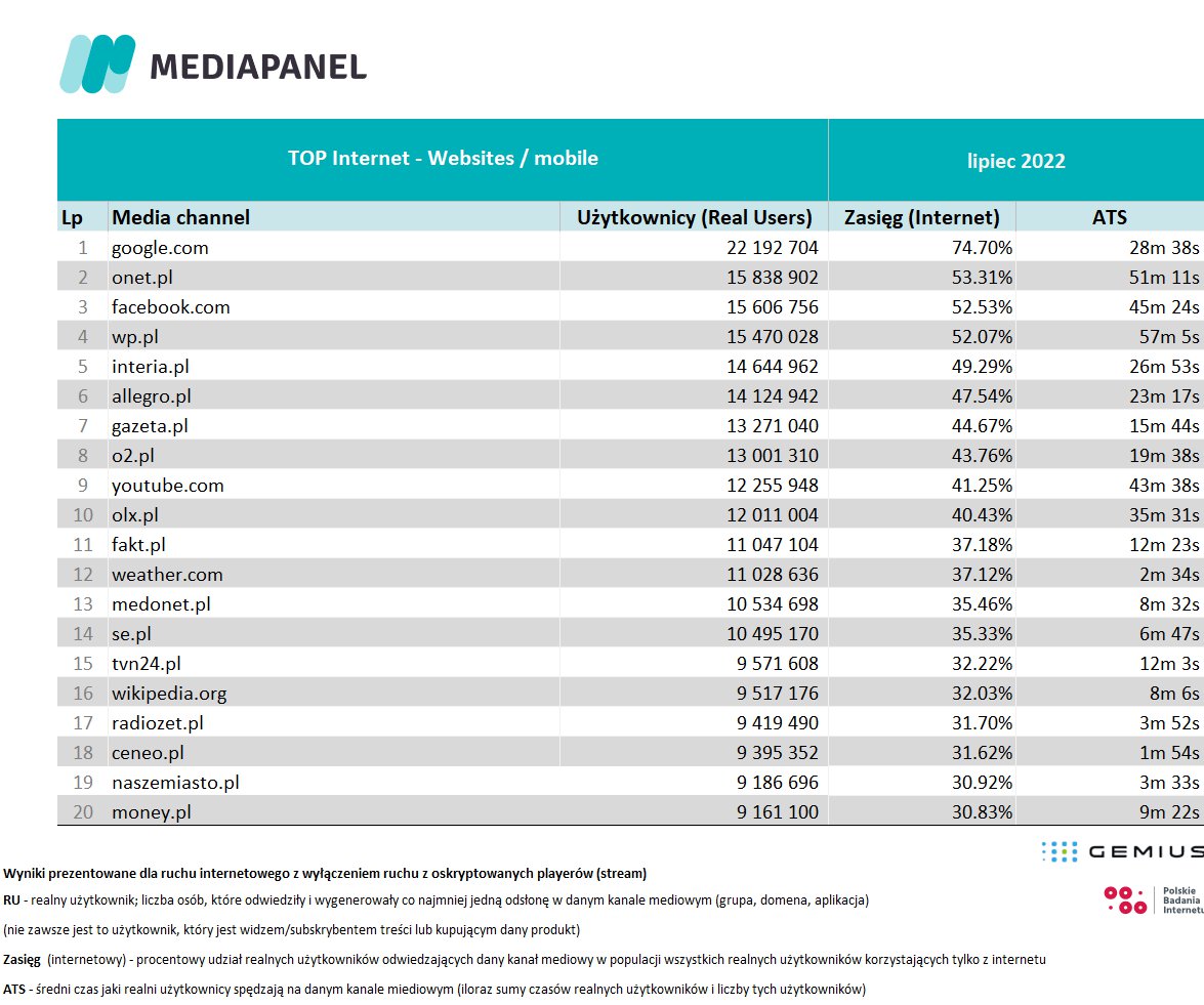 W lipcu liczba internautów wyniosła 29,6 mln. Średnio dziennie korzystało z tego medium 25,3 mln osób.