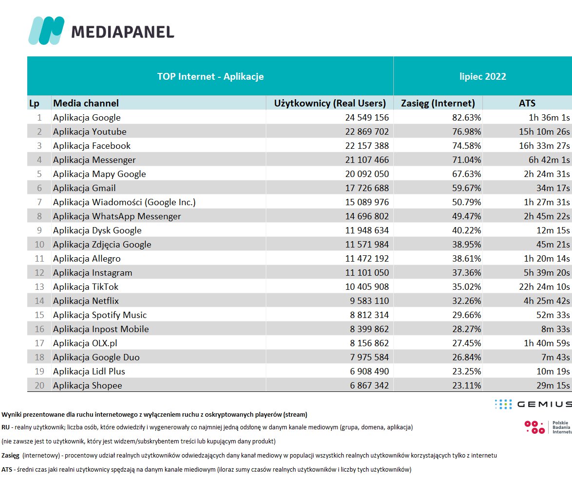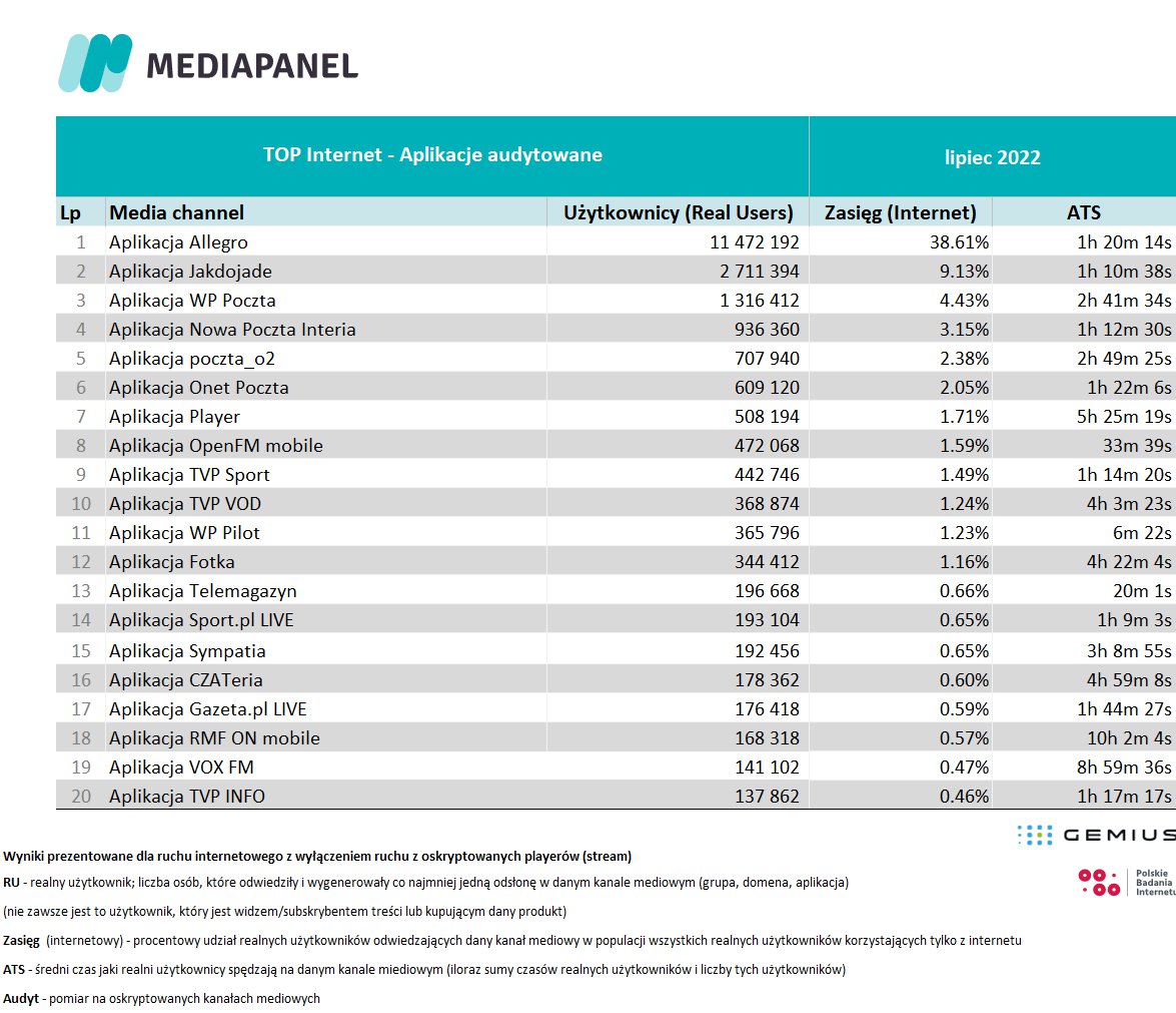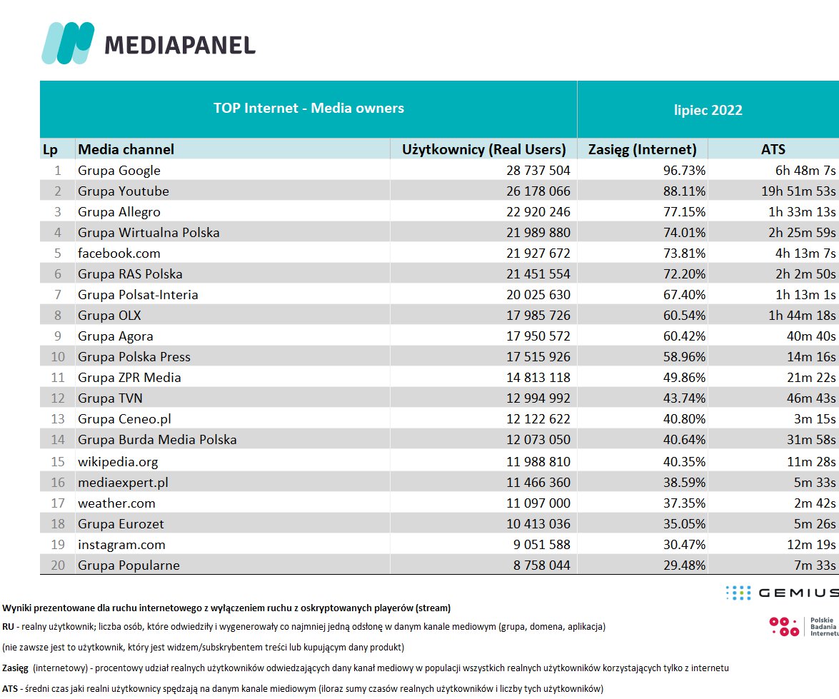 W lipcu liczba internautów wyniosła 29,6 mln. Średnio dziennie korzystało z tego medium 25,3 mln osób.