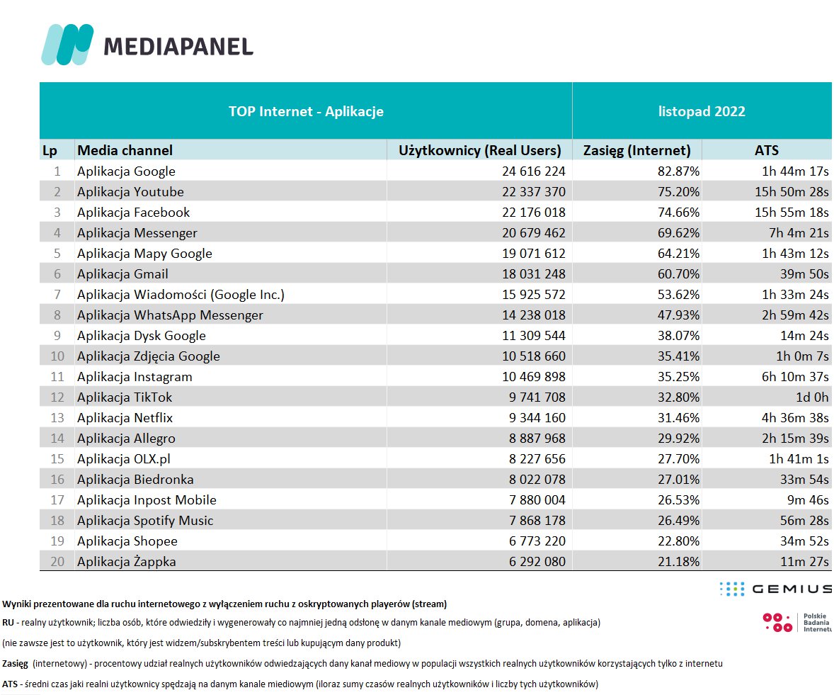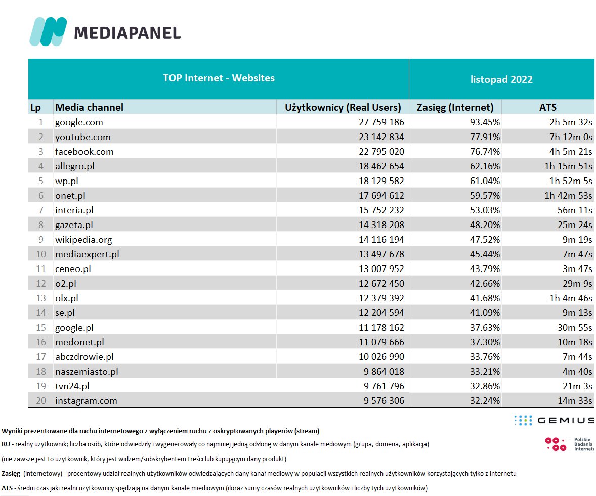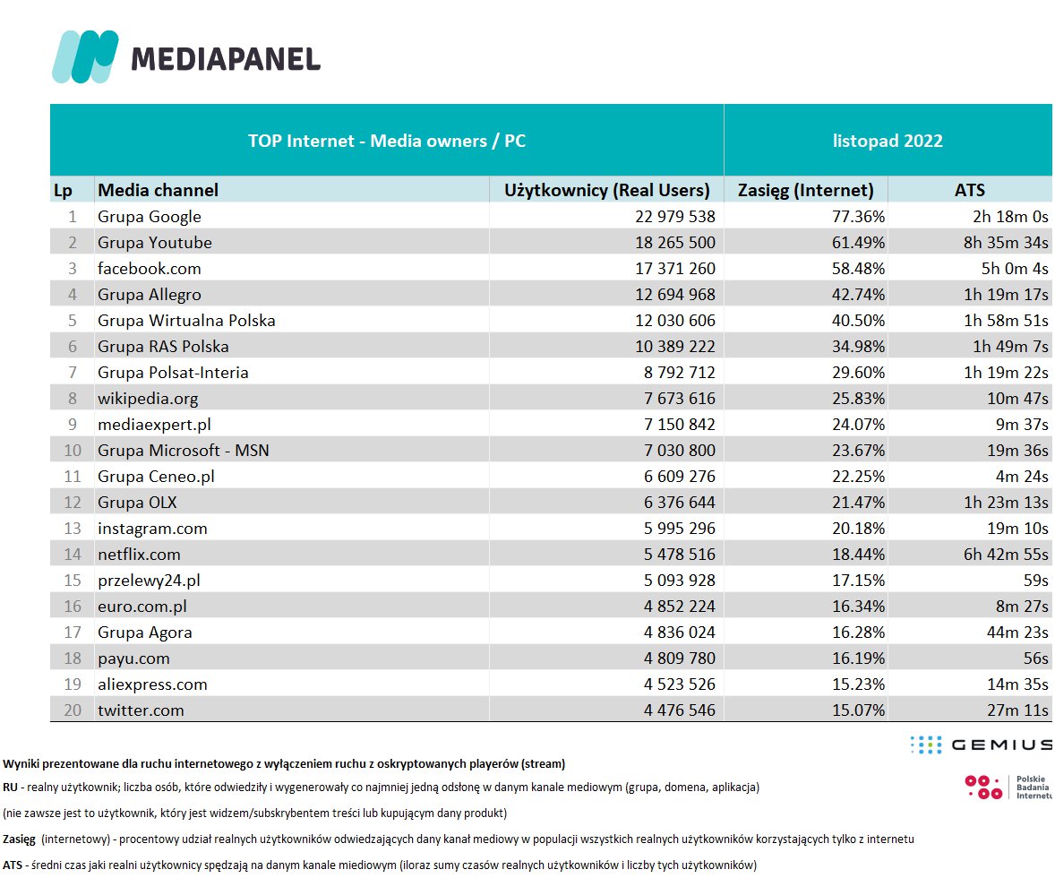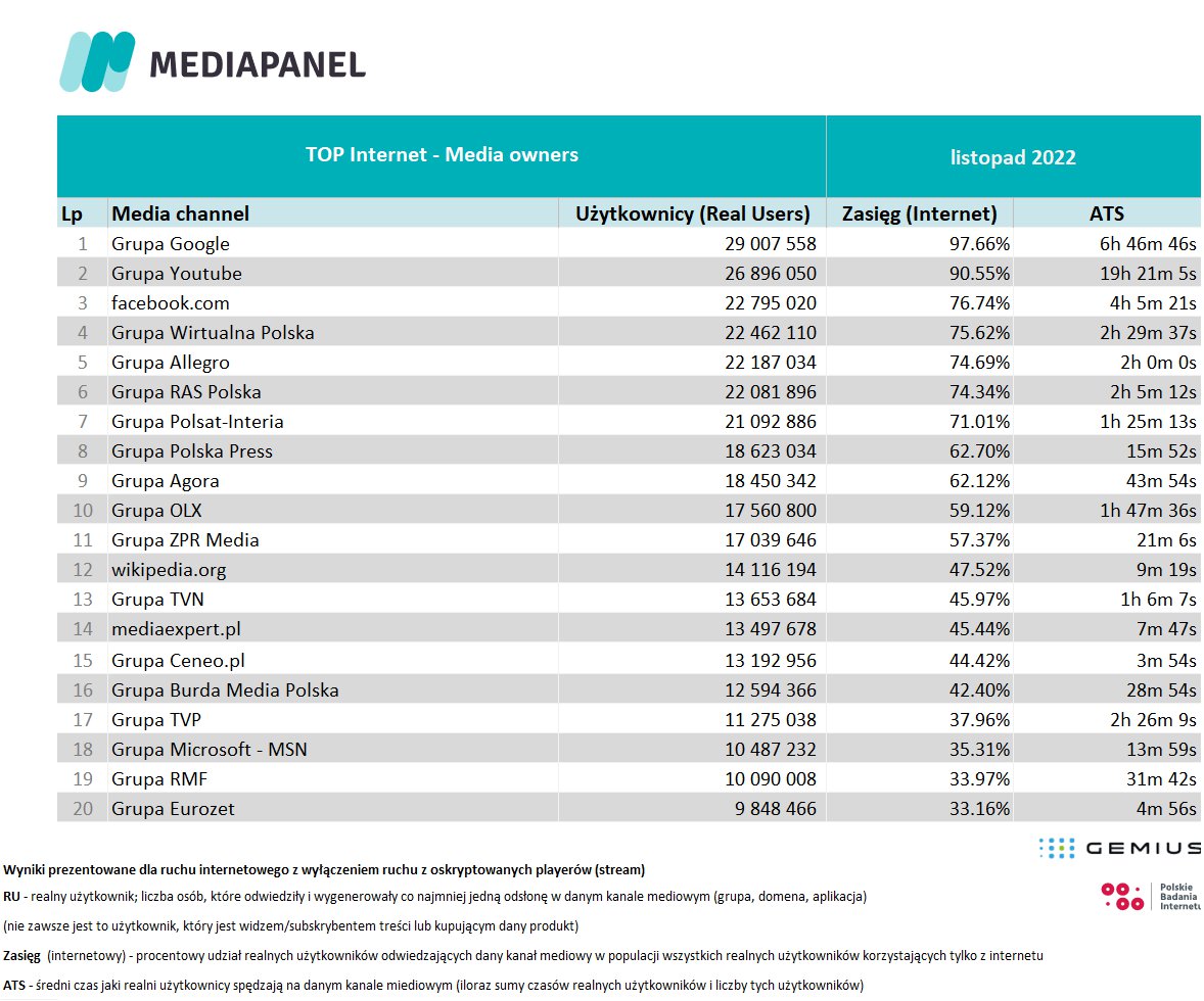 W listopadzie liczba internautów wyniosła 29,7 mln. Średnio dziennie korzystało z tego medium 25,9 mln osób.