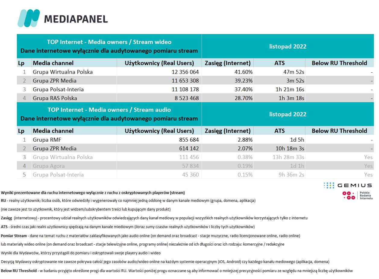 Prezentujemy również zestawienie audytowanych playerów audio i wideo – ich wyniki pokazujemy w agregacji do grup mediowych, biorących udział w badaniu.