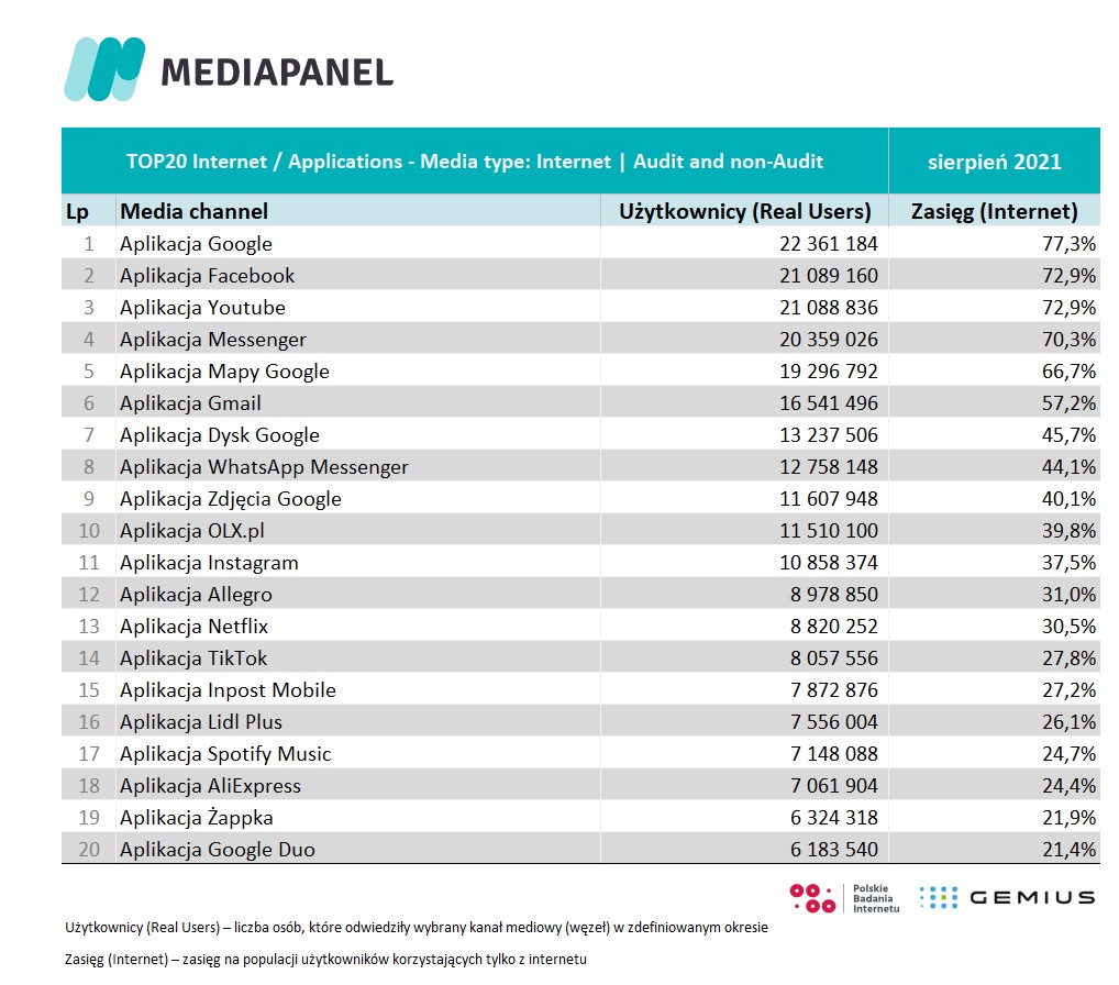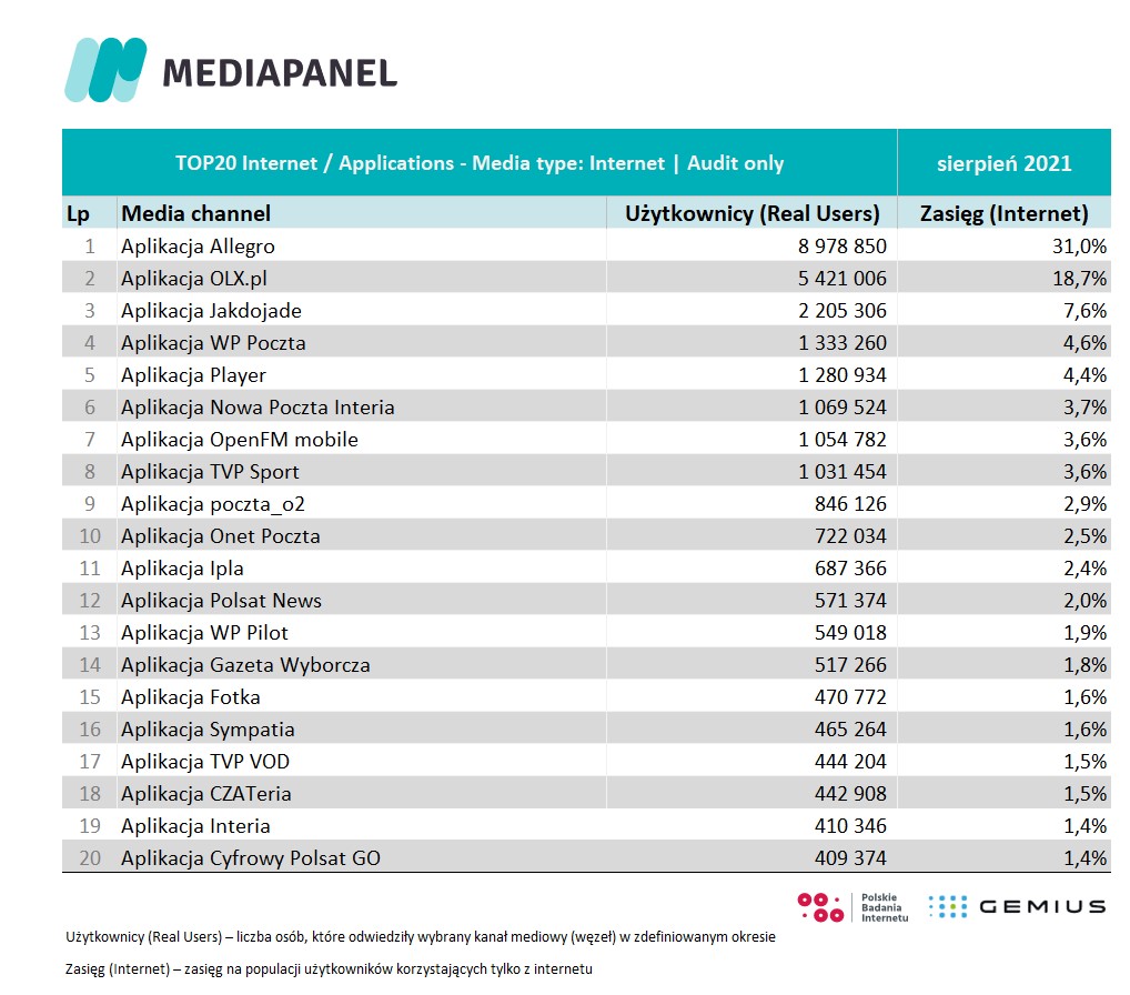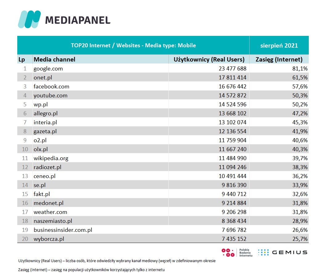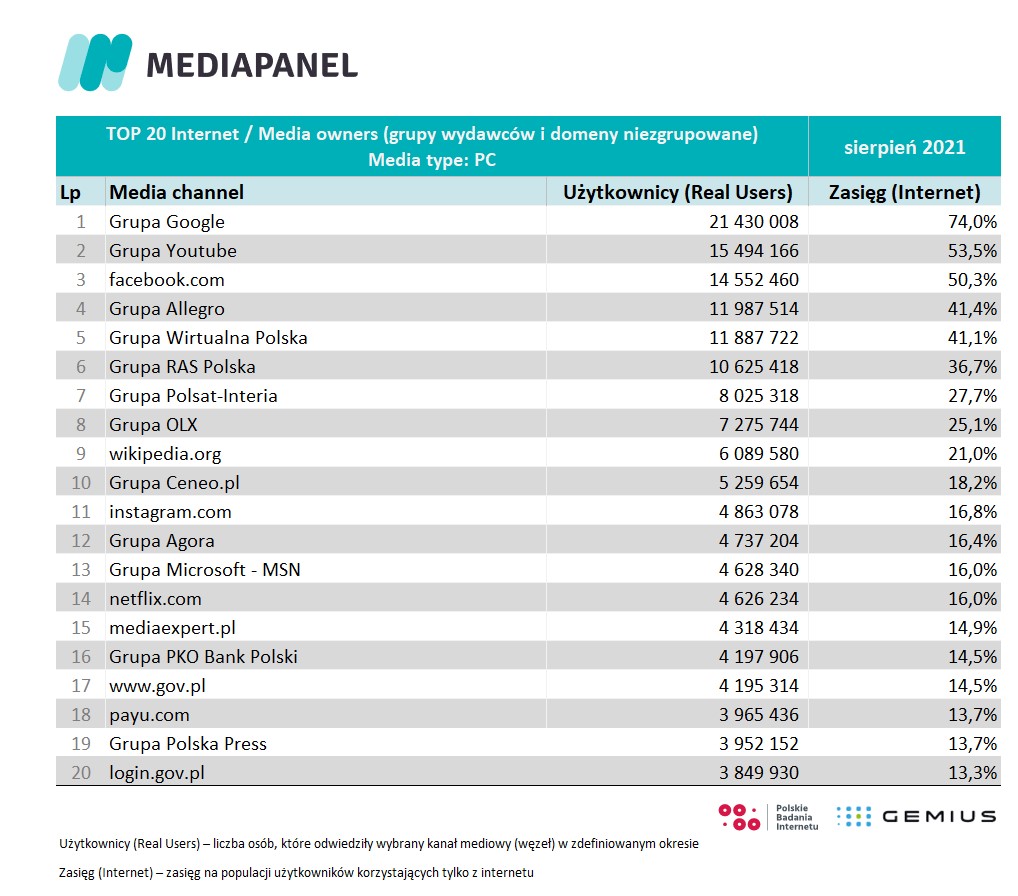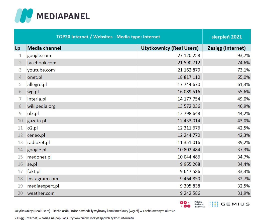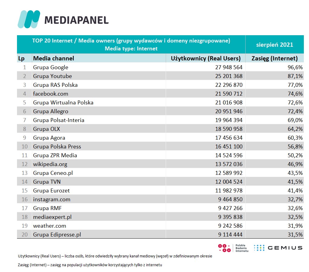 W sierpniu liczba internautów wyniosła 28,9 mln. Średnio dziennie korzystało z tego medium 24,1 mln osób.