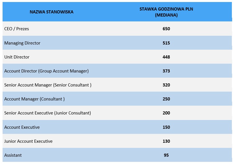 Badanie wynagrodzeń obejmowało również określenie wartości stawek cennikowych, a więc stawek pokrywających wszystkie koszty związane z realizacją projektu oraz zawierające marżę, które są prezentowane klientom na etapie wyjściowym negocjacji kontraktu.