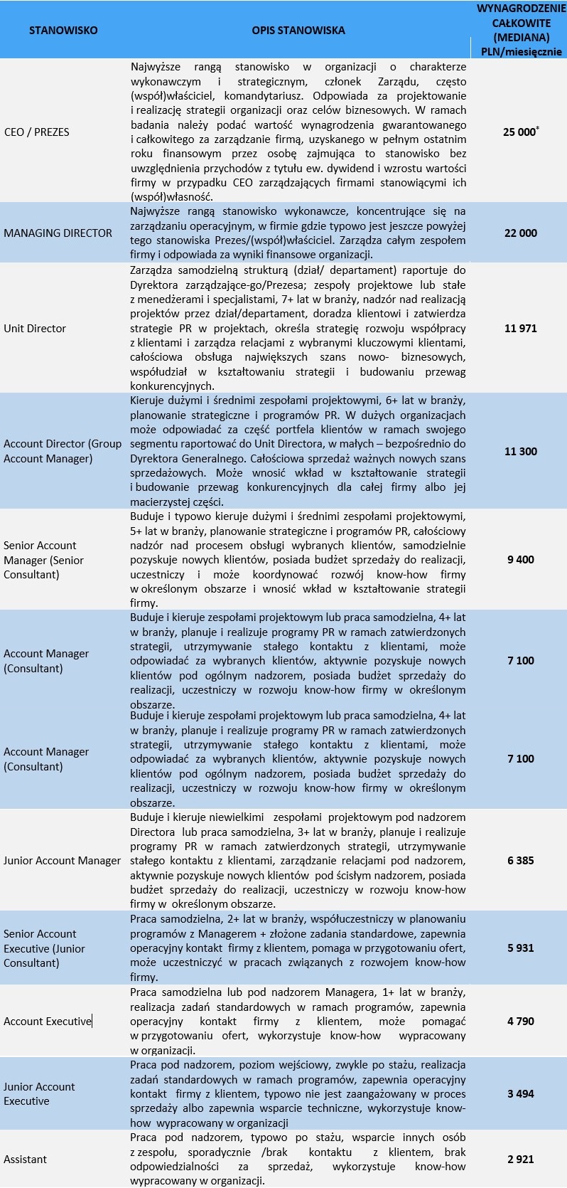 W tabeli poniżej zaprezentowano wartości przeciętnych miesięcznych wynagrodzeń całkowitych brutto z umów o pracę (rynkowa mediana) dla typowych stanowisk w branży public relations.