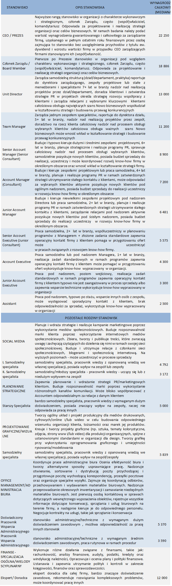 W tabeli poniżej zaprezentowano wartości przeciętnych wynagrodzeń (rynkowa mediana), dla typowych stanowisk dla branży public relations, dla płacy całkowitej. Roczna płaca całkowita to suma rocznej płacy gwarantowanej brutto i wartości zmiennych składników wynagrodzenia należnych w całym roku kalendarzowym 2016. Poniżej prezentowane są mediany w wymiarze miesięcznym (roczna płaca całkowita podzielona przez 12). Wartość wyrażona brutto dla umów o pracę i cywilnych – czyli obejmuje kwotę przekazaną pracownikowi oraz pobrany PIT i tzw. „ZUS pracownika”.