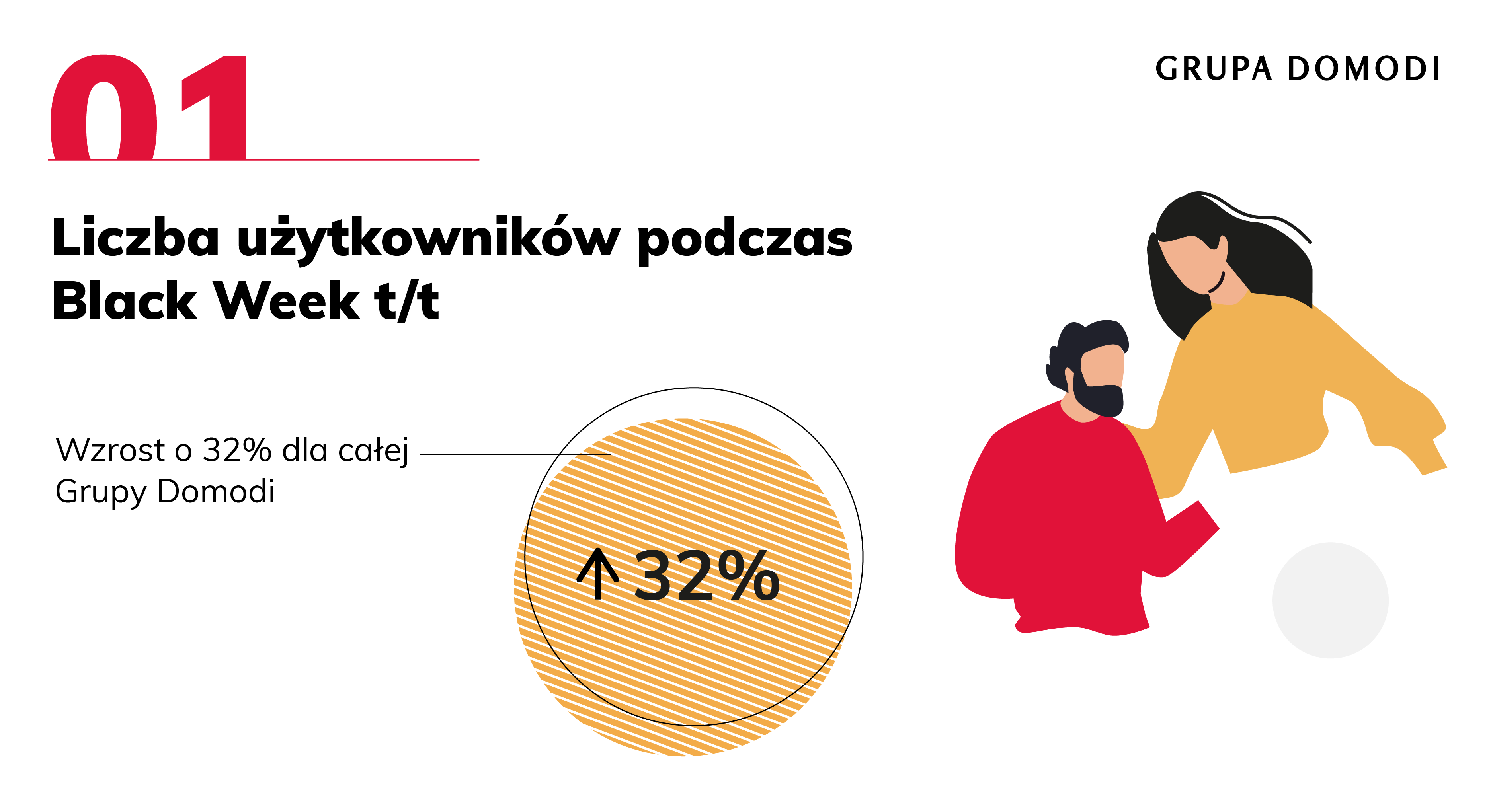 Black Week wciąż cieszy się dużą popularnością wśród polskich e-konsumentów, szczególnie w kategorii fashion. Wielu z nich z błyskiem w oku czeka na spektakularne wyprzedaże, aby upolować wymarzone modowe perełki w atrakcyjnych cenach. Na platformach Grupy Domodi podczas Black Week użytkownicy mogli znaleźć tysiące produktów w obniżonych cenach, a rabaty sięgały nawet 80%. Tak niskie ceny i wyjątkowe okazje zakupowe przyciągnęły do serwisów Domodi i Allani aż o 32% więcej użytkowników t/t.