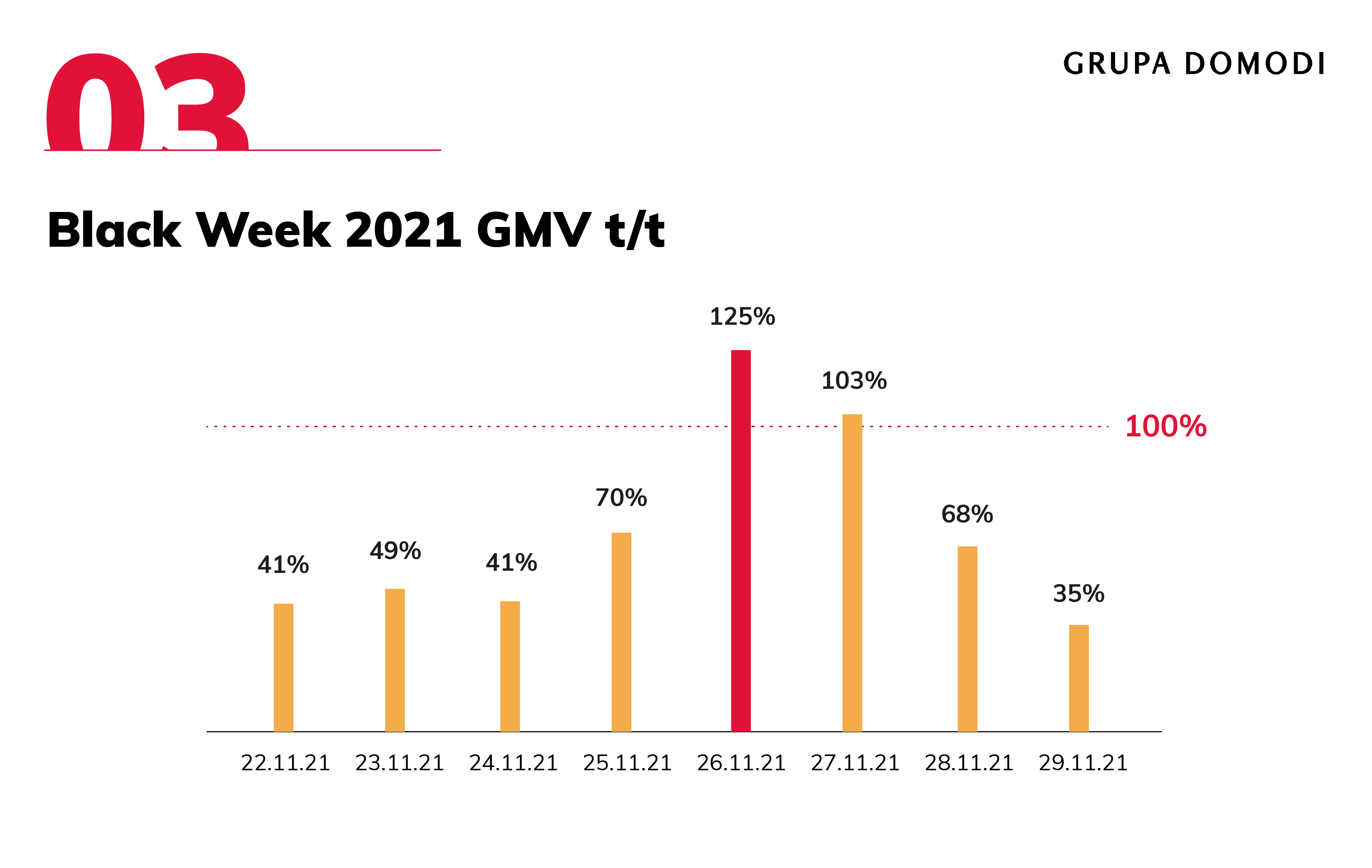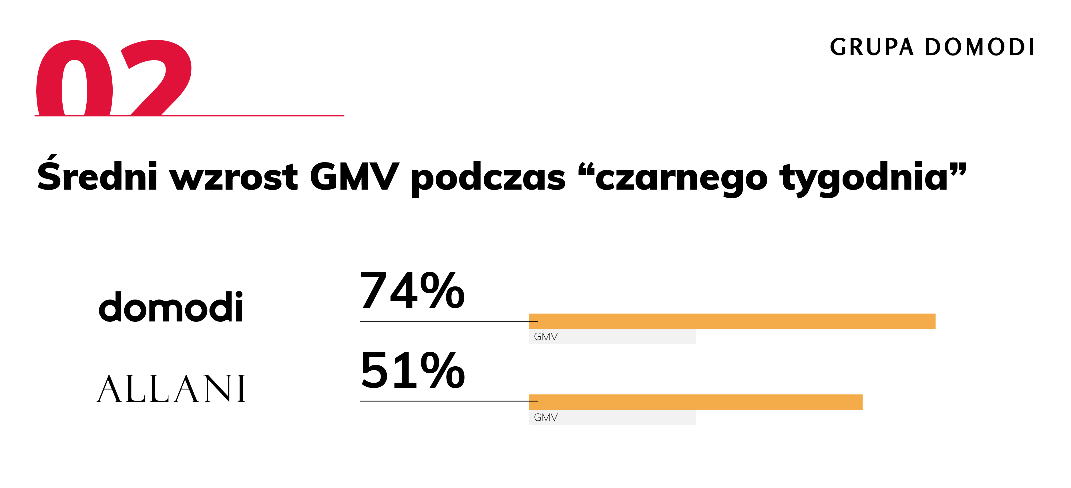 Najwyższe piki zakupowe przypadły tradycyjnie na Czarny Piątek oraz niedzielę, choć w każdym dniu objętym akcją Black Week serwisy zanotowały znaczne wzrosty GMV – od poniedziałku do czwartku o 50%, a w okresie piątek–niedziela nawet o 100% t/t. Daje to średni wzrost GMV podczas „czarnego tygodnia” aż o 74% dla Domodi.pl i 51% dla Allani.pl.