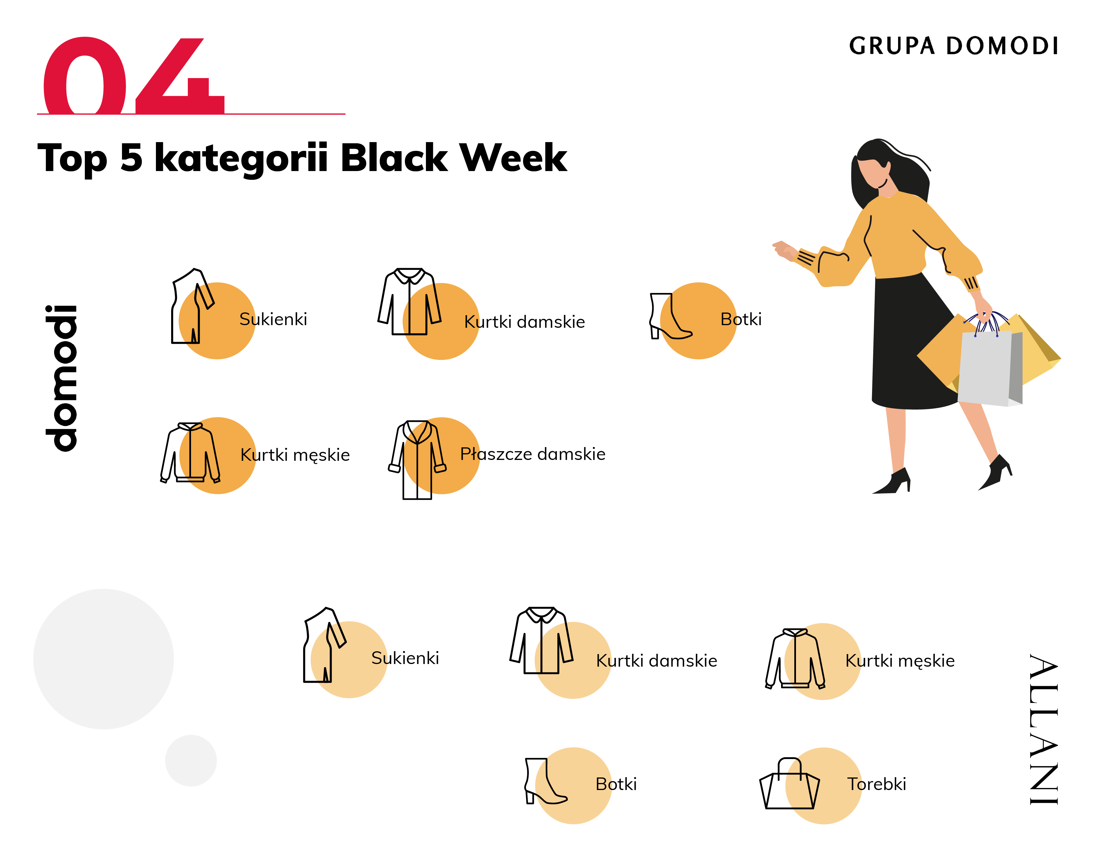 – Pod względem kategorii zakupowych użytkownicy Grupy Domodi są konsekwentni w swoich wyborach i już od lat obserwujemy, że wśród najchętniej kupowanych produktów podczas Black Week królują sukienki oraz kurtki damskie i męskie. W tym roku wysoką pozycję osiągnęła także kategoria obuwie, a konkretnie botki, które równie chętnie kupowane były na obu platformach należących do Grupy Domodi. Natomiast Top 5 najlepiej sprzedających się kategorii zamykają dla Domodi.pl – płaszcze damskie, a dla Allani.pl – torebki – komentuje Martyna Głowińska-Gryglewska, head of marketing & communications Grupy Domodi.
