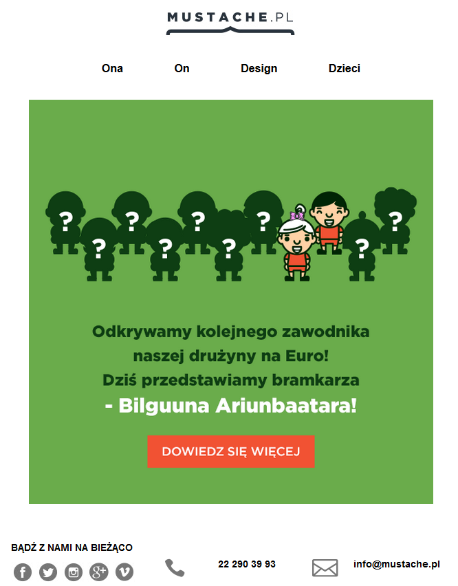 Jednym z wydarzeń, które było często wykorzystywane w działaniach e-mail marketingowych, była Liga Mistrzów UEFA 2016. Kampanią, która zwróciła moją szczególną uwagę, była ta przeprowadzona przez firmę Mustache.pl. Marka ta w sposób bardzo kreatywny wykorzystała wspomniane wydarzenie sportowe i w kilku kolejnych e-mailach zawarła banner, przedstawiający kolejnych zawodników swojej drużyny.