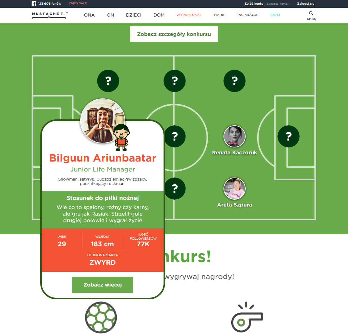 Po przejściu na landing page odbiorca mógł zapoznać się zarówno z kolejnymi sylwetkami drużyny przyjaciół Mustache.pl, jak i zasadami odbywającego się z okazji Euro konkursu. Sama prezentacja poszczególnych osób była równie ciekawa i – oczywiście – osadzona w sportowej, nawiązującej do wydarzenia narracji.