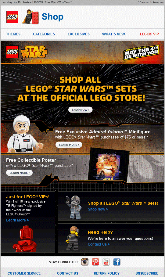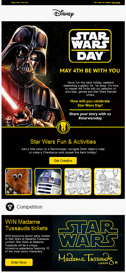 Kolejnym wydarzeniem, na punkcie którego dosłownie oszalał świat, była premiera „Gwiezdnych Wojen”. Nic więc dziwnego, że była ona tak chętnie wykorzystywana w kampaniach real-time marketingowych wielu firm. Również w działaniach e-mail marketingowych znalazło się dla niej miejsce. Poniżej przykłady Disney i LEGO: