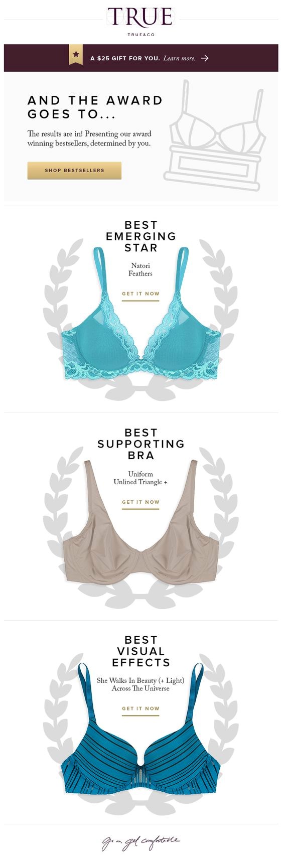 Pozostając w temacie filmowym, nie można nie wspomnieć o gali rozdania Oskarów, wokół której za każdym razem jest wiele szumu i spekulacji na temat jej wielkich przegranych i zwycięzców. Poniżej przykład newslettera firmy True&Co., która wykorzystała narrację związaną z rozdaniem nagród filmowych do prezentacji swoich produktów.