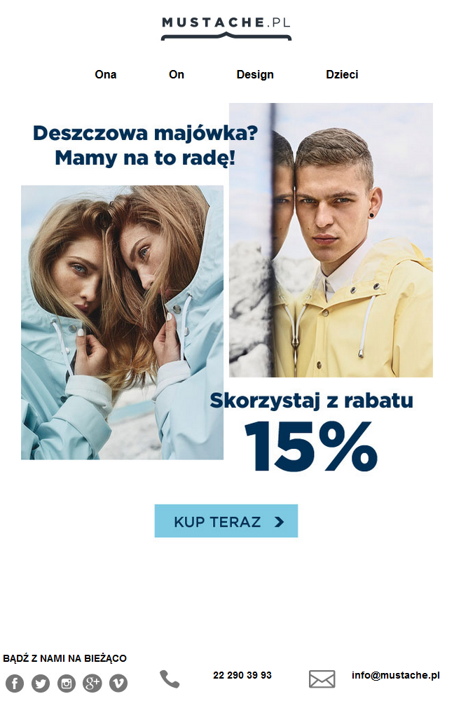 Na koniec przykład kolejnego newslettera od Mustache.pl, wysłanego tuż przed długim weekendem majowym. Pogoda nas wtedy nie rozpieszczała, jednak marka wykorzystała niekorzystne prognozy pogody do zaproponowana swoim odbiorcom odpowiednich na tę okazję ubrań.