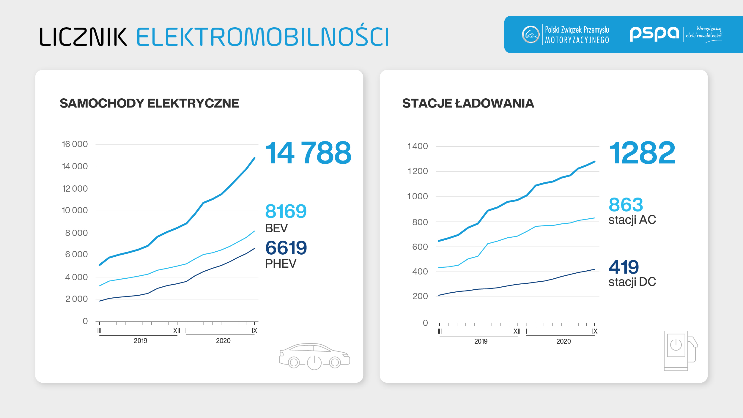 Pod koniec września 2020 r., po polskich drogach jeździło 14,7 tys. elektrycznych samochodów osobowych, z których 55% (8,1 tys.) stanowiły pojazdy w pełni elektryczne (BEV, ang. battery electric vehicles), a pozostałą część (6,6 tys.) hybrydy typu plug-in (PHEV, ang. plug-in hybrid electric vehicles) – wynika z Licznika elektromobilności PSPA i PZPM. W tym czasie funkcjonowało 1,2 tys. ogólnodostępnych stacji ładowania (2,4 tys. punktów).