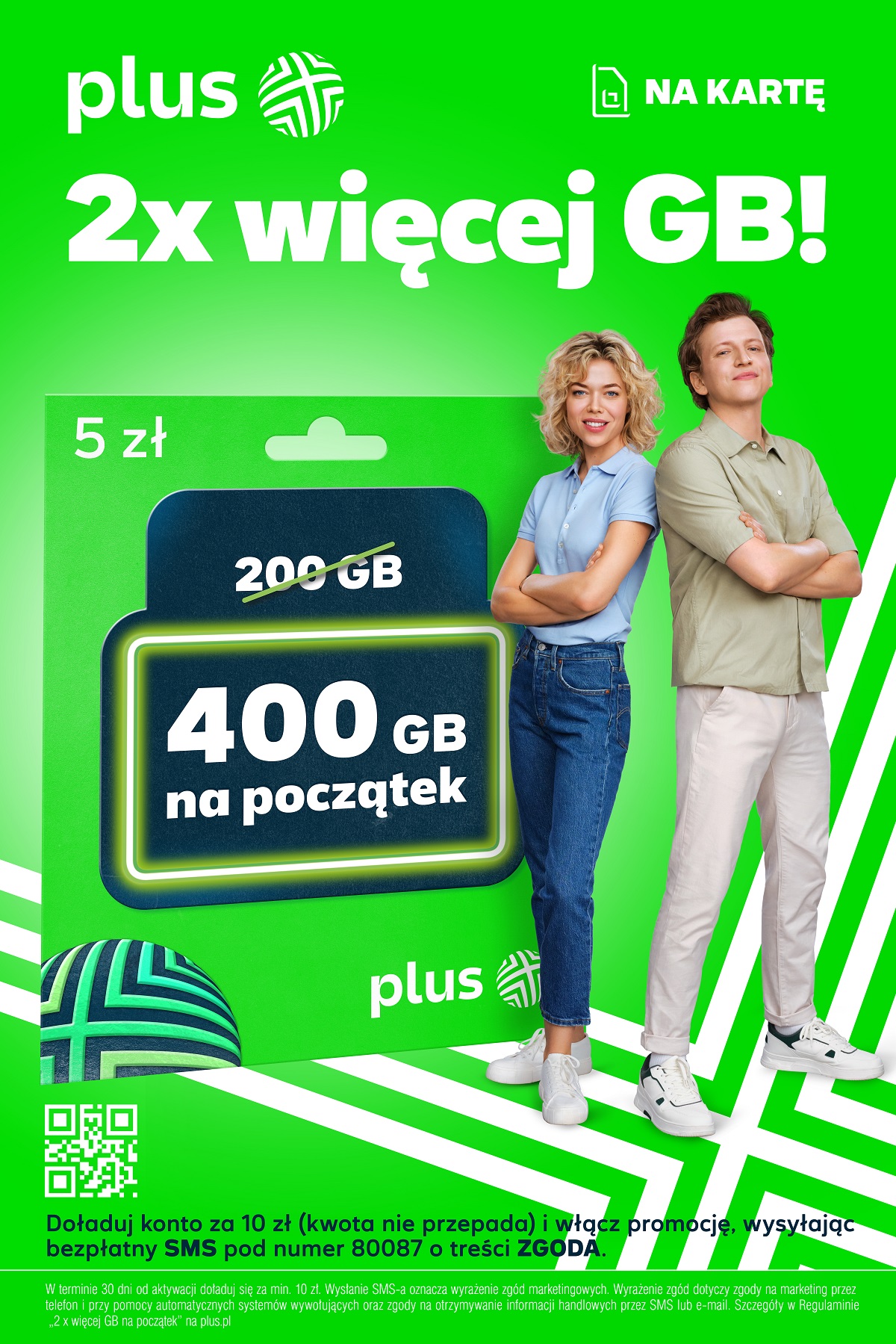 Podstawą humorystycznej i ożywionej rozmowy aktorów w reklamie jest podwojony pakiet powitalny w ofercie Plus na Kartę. Nowi użytkownicy mogą otrzymać 2 razy więcej gigabajtów, czyli aż 400 GB na początek. Wystarczy kupić starter i w ciągu 30 dni od aktywacji wykonać doładowanie za min. 10 zł, oraz wysłać SMS o treści ZGODA pod numer 80087. Co ważne, doładowanie nie przepada i można je wykorzystać na dowolne pakiety, połączenia lub SMS-y.