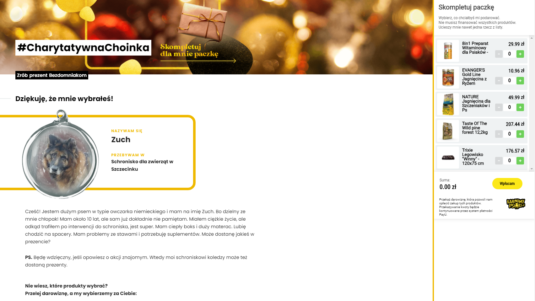 Na pomoc czeka niemal 700 czworonogów z 23 schronisk z całej Polski. Każdy z nich ma przypisany koszyk produktów wskazanych przez organizację sprawującą nad nim opiekę bezpośrednią – może znajdować się w nim specjalistyczna karma, ubranko na zimę czy nowe legowisko.
