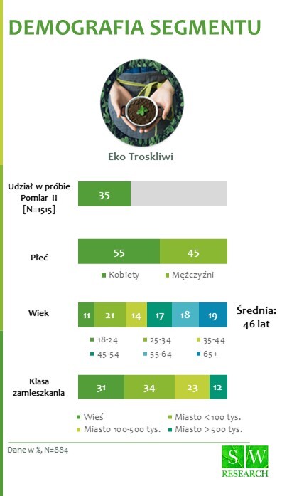 Eko Troskliwi są najliczniejszym segmentem. Stanowią 35% polskiego społeczeństwa, co oznacza, że jest ich około 13 mln Polaków. Przeważają w nim kobiety (55%), a ze względu na wiek nie wyróżniają się na tle średniej populacyjnej – przeciętny Eko Troskliwy ma 46 lat. Najliczniejszą grupą są osoby w wieku 25-34 lata (21%) oraz osoby po 65 roku życia (19%). Najczęściej Eko Troskliwi pochodzą z miast do 100 tys. mieszkańców (34%).