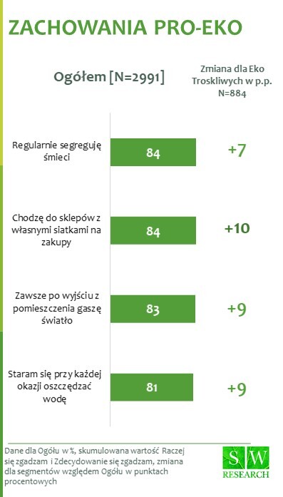 Eko Troskliwi mają prawidłowo wykształcone nawyki pro-ekologiczne. 94% chodzi do sklepów z własnymi siatkami na zakupy, a 91% regularnie segreguje śmieci – dla wymienionych czynności odsetki te dla ogółu Polaków wynoszą po 84%. Podobnie często gaszą światło po wyjściu z pomieszczenia (92%, Ogółem – 83%) i starają się oszczędzać wodę przy każdej okazji (90%, Ogółem – 81%).