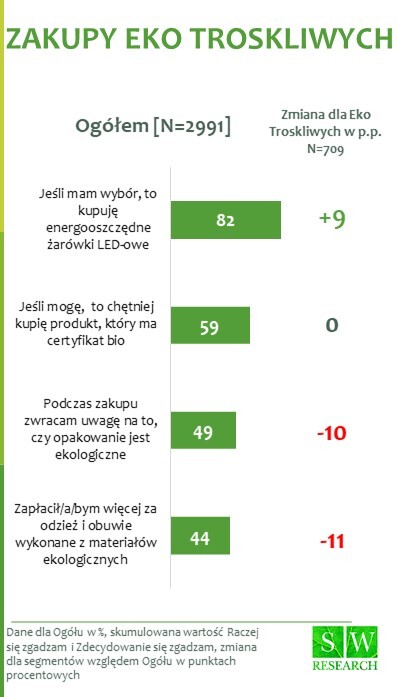 Osoby z segmentu Eko Troskliwych nie przywiązują specjalnie dużej wagi do produktów z certyfikatami bio czy takimi w ekologicznych opakowaniach. Produkt opatrzony certyfikatem bio chętniej kupiłoby 59% Troskliwych, gdyby mieli taką możliwość (tyle samo co ogół społeczeństwa – 59%), a ekologiczne opakowanie jest ważne dla 39% osób z tego segmentu (kiedy dla ogółu Polaków ten odsetek jest wyższy i wynosi 49%). Również za odzież i obuwie wykonane z materiałów ekologicznych Eko Troskliwi (33%) są mniej skłonni niż Ogół (44%) do zapłacenia więcej. Wyjątkiem wśród nawyków zakupowych Troskliwych są energooszczędne żarówki LED-owe, których zakup deklaruje aż 91% osób z segmentu Eko Troskliwych, gdzie dla Ogółu odsetek ten wynosił 82%.