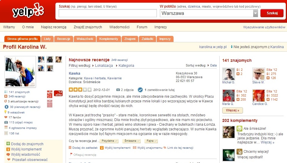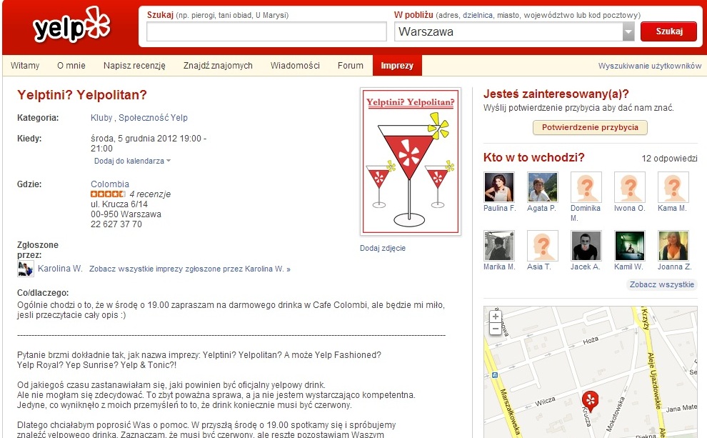 W najbliższą środę 5.12.2012, o godz. w warszawskiej Cafe Colombi będziemy mogli osobiście (a przynajmniej ci, którzy będą wtedy w pobliżu) poznać Karolinę i zapewne najbliższe plany Yelpa. Wydarzenie oczywiście jest już utworzone w serwisie.