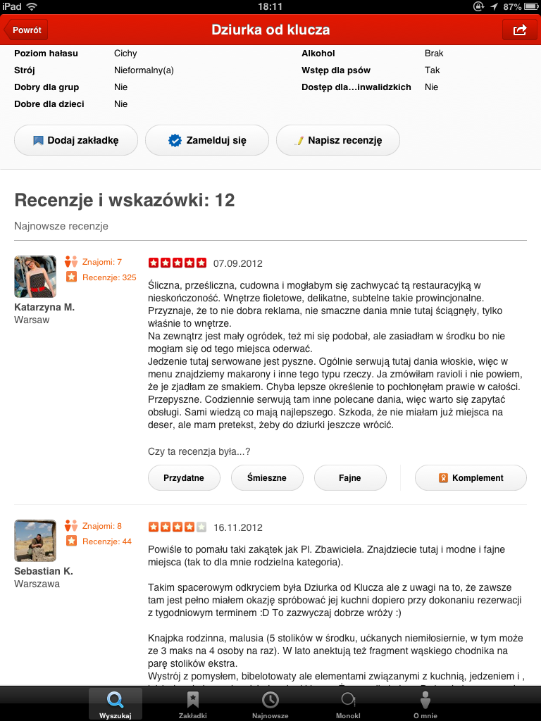 Yelp dysponuje unikalnym systemem oceniania recenzji i wykluczania tych, które są po prostu tekstami marketingowymi. Pozycja w rankingu zależy od recenzji, liczby yelperów odwiedzających miejsce, ocen, ale i także od wiarygodności poszczególnych recenzentów. Z moich obserwacji wynika, że system wyłapywania fake’owych recenzji nie jest bezbłędny, ale generalnie daje sobie radę, co może być wielkim atutem serwisu. Zapewne polscy przedsiębiorcy mogą się obawiać nadmiaru negatywnych opinii, ale Yelp przekonuje, że dzielimy się opiniami głównie wtedy, kiedy jesteśmy zadowoleni.