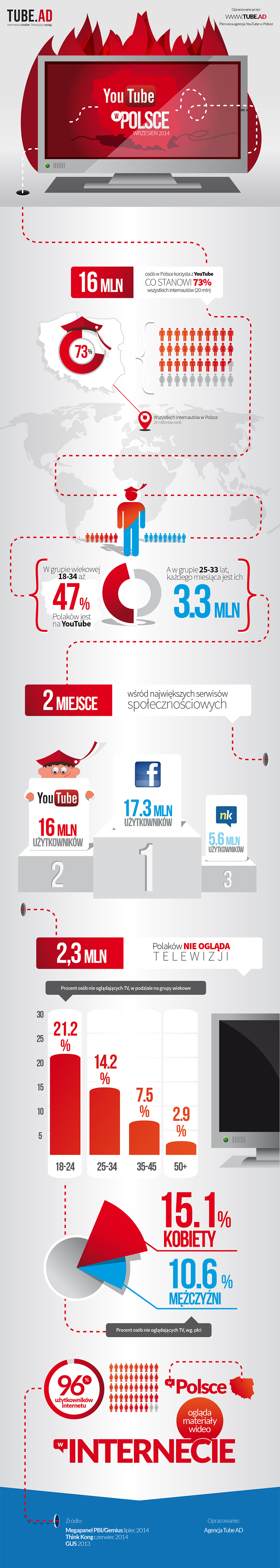 YouTube ma już wyrobioną pozycję online. 73% internautów odwiedza go w celach rozrywkowych, edukacyjnych i informacyjnych. Serwis depcze dość mocno po piętach Facebook’owi z wynikiem 16 mln użytkowników miesięcznie. Aż 3,3 mln Polaków w grupie wiekowej 25-33 korzysta każdego miesiąca z YouTube. Natomiast 50% użytkownik to osoby w wieku 18-34 lat, których to łączy jedna wspólna cecha. Nie oglądają telewizji. Wg badań agencji Think Kong jest ich 2,3 mln (21% w wieku 18-24).