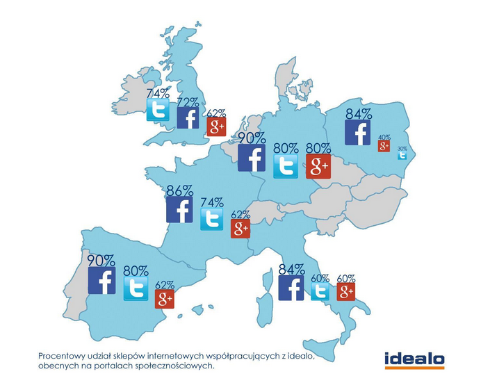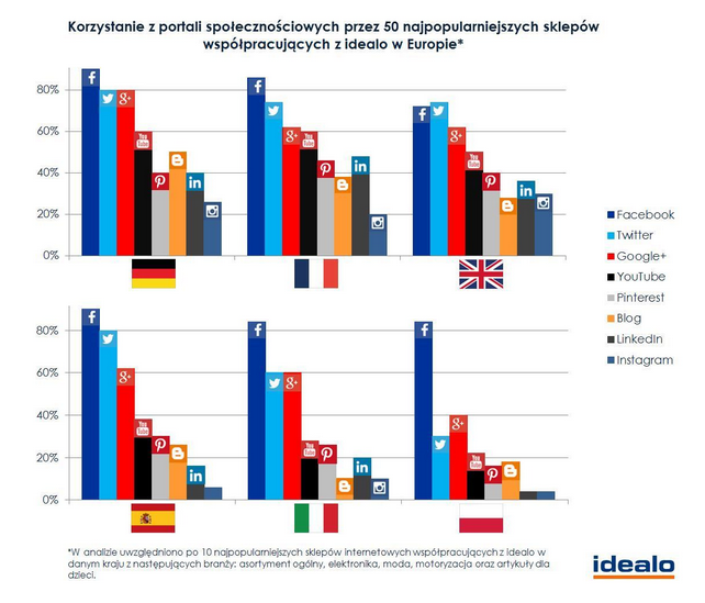 W badaniach uwzględnione zostały sklepy internetowe współpracujące z idealo z Polski, Niemiec, Francji, Wielkiej Brytanii, Włoch i Hiszpanii. Porównanie wszystkich sześciu europejskich rynków wyraźnie pokazuje, że niemal we wszystkich krajach zdecydowanie najczęściej wybieranym e-sklepy portalem społecznościowym jest Facebook. Jedynie w Wielkiej Brytanii serwis ten nieznacznie przegrywa z Twitterem. Tym bardziej zaskakujący jest fakt, że brytyjskie sklepy i tak sięgają po platformę do mikroblogowania rzadziej (w 74%) niż sprzedawcy z Hiszpanii i Niemiec (po 80%), w których największy odsetek sklepów korzysta z usług zarówno Twittera, jak i Facebooka.