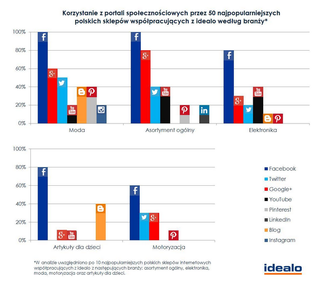 Spojrzenie na wyniki badań idealo według poszczególnych zanalizowanych branży potwierdza fakt, że w Polsce to Facebook jest najczęściej wykorzystywaną platformą służącą do tworzenia społeczności dla klientów sklepów internetowych. Godnym uwagi jest jednak także wysokie zainteresowanie Google+ wśród sprzedawców oferujących asortyment ogólny. I to właśnie te sklepy, posiadające liczne kategorie produktów i trudne do przyporządkowania do jednej branży, są wraz ze sprzedawcami z działu mody i elektroniki najczęściej reprezentowane na portalach społecznościowych.