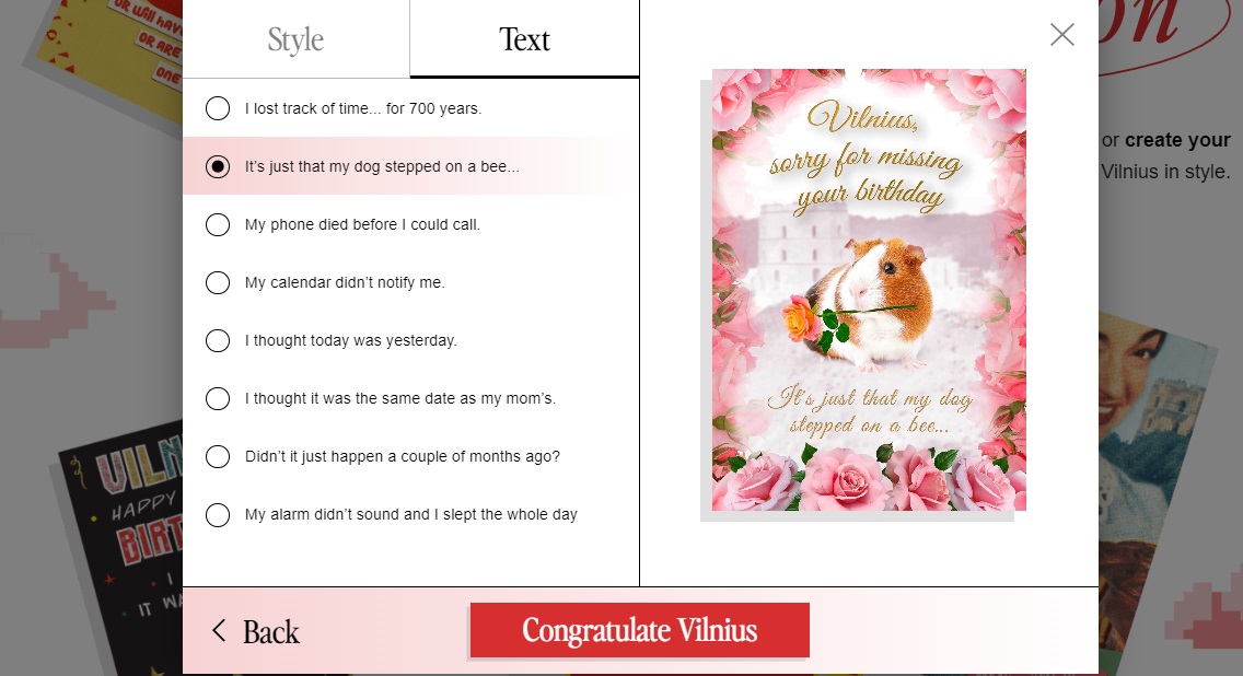 Na stronie znalazła się również „Kolekcja spóźnionych e-kartek urodzinowych dla Wilna”. Użytkownik może skorzystać z gotowych szablonów lub stworzyć własną e-kartkę, a następnie przesłać spóźnione życzenia dla 700-letniego miasta.