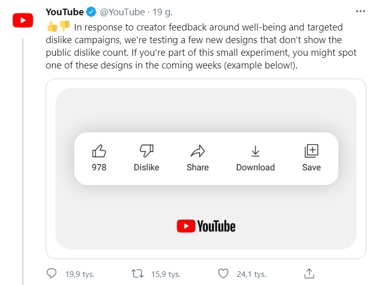 Samo menu, w którym znajdują się ikonki, takie jak kciuk w górę, kciuk w dół czy też „share”, nie zostanie zmienione. Wraz z nową aktualizacją usunięty zostanie licznik „łapek w dół”, wciąż jednak będzie się wyświetlała liczba osób, którym dane wideo się podoba.