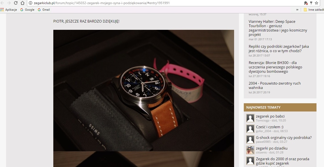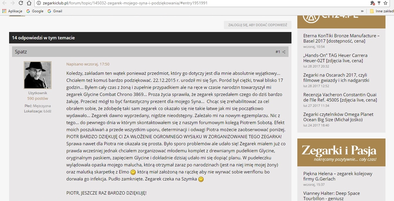 Ponadto uważam, że jednym z kluczowych czynników tworzenia historii produktu luksusowego i marki, który w pozytywny sposób przekłada się na wizerunek, jest indywidualne podejście do każdego klienta. 6 marca 2017 roku na forum Klubu Miłośników Zegarów i Zegarków użytkownik Spatz opublikował post, w którym dziękuje Piotrowi Sobocie, przedstawicielowi marki Glycine w Polsce za zdobycie unikatowego zegarka dla swojego nowonarodzonego dziecka.