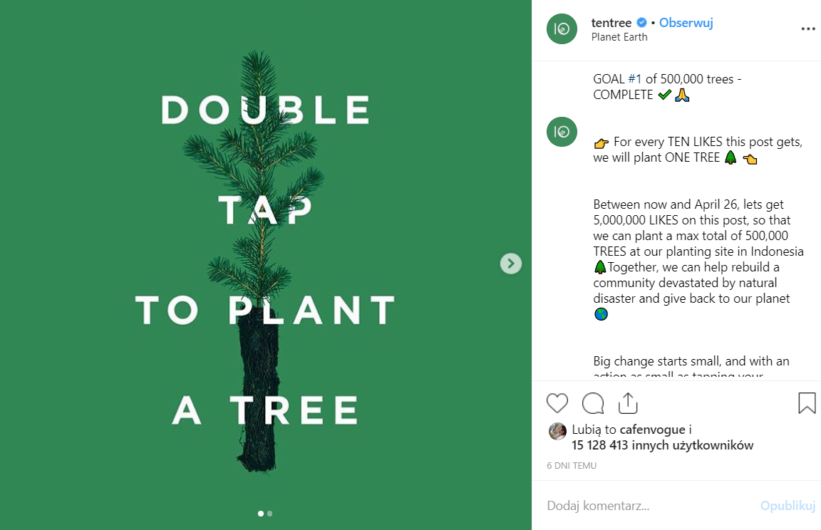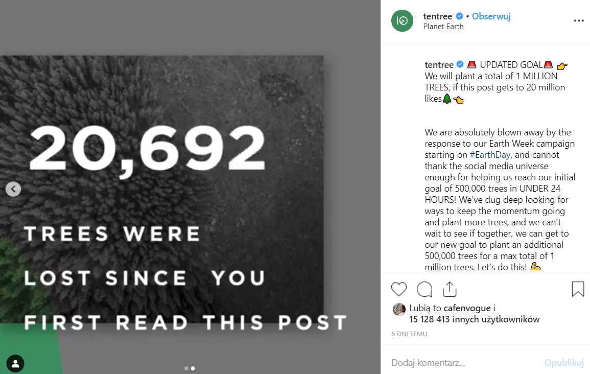Firma tentree zajmuje się produkcją odzieży z recyklingu. Niedawno wpadła na pomysł stworzenia akcji, która miała na celu zachęcenia użytkowników do interakcji w szczytnym celu. Na swoim profilu na Instagramie marka zamieściła zdjęcie drzewa, zaś w opisie napisała, że za każde 10 polubień fotografii posadzi jedno nowe drzewo.