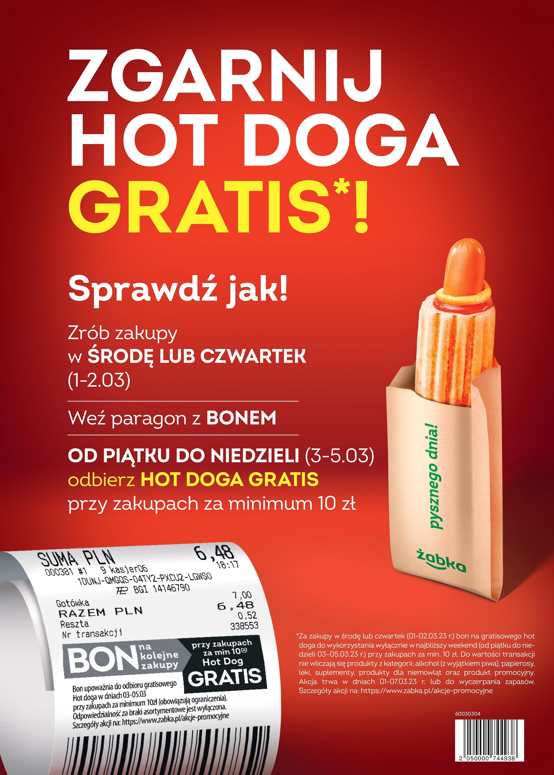 Bon promocyjny na kolejne zakupy (wydrukowany na paragonie), który upoważnia do odbioru gratisowego hot doga, otrzyma każdy klient, który w dniach 1-2 oraz 8-9 marca zrobi zakupy w sklepie Żabka. Ciepłą przekąskę będzie można odebrać w dowolnej placówce sieci w dniach 3-5 oraz 10-12 marca, przy zakupach za min. 10 zł.