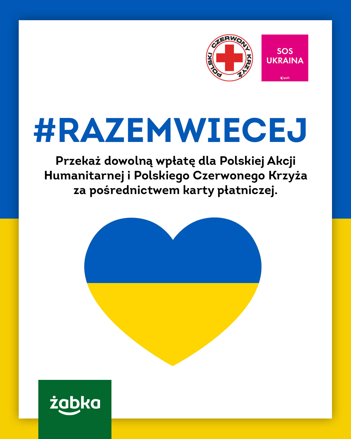 Od 3 marca br. klienci przy okazji wizyty w sklepach sieci Żabka, mają możliwość bezpiecznego przekazania datków za pośrednictwem płatności bezgotówkowych. Można wskazać dowolnie wybraną przez siebie kwotę (kwota minimalna nie została określona), nie ma konieczności robienia zakupów w sklepach sieci. Zebrane w ten sposób środki zostaną przekazane Polskiej Akcji Humanitarnej oraz Polskiemu Czerwonemu Krzyżowi.