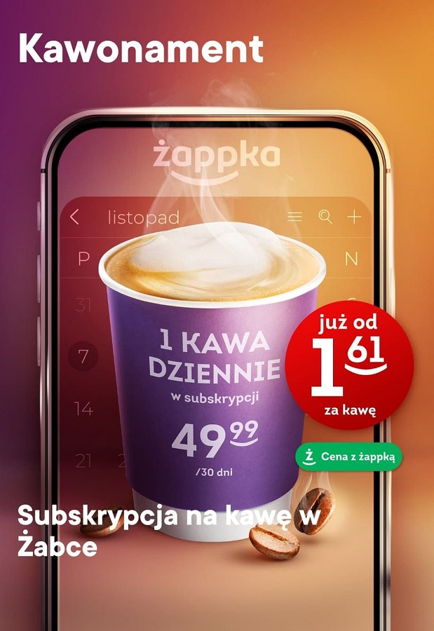 W aplikacji mobilnej Żappka pojawiła się informacja o nowej usłudze – Kawonamencie. Wybierając miesięczną subskrypcję, miłośnicy kawy mogą codziennie odbierać ciepły napój w cenie 1,61 zł. Dla porównania – cena 40-ml espresso poza subskrypcją kosztuje w Żabce 3,99 zł.