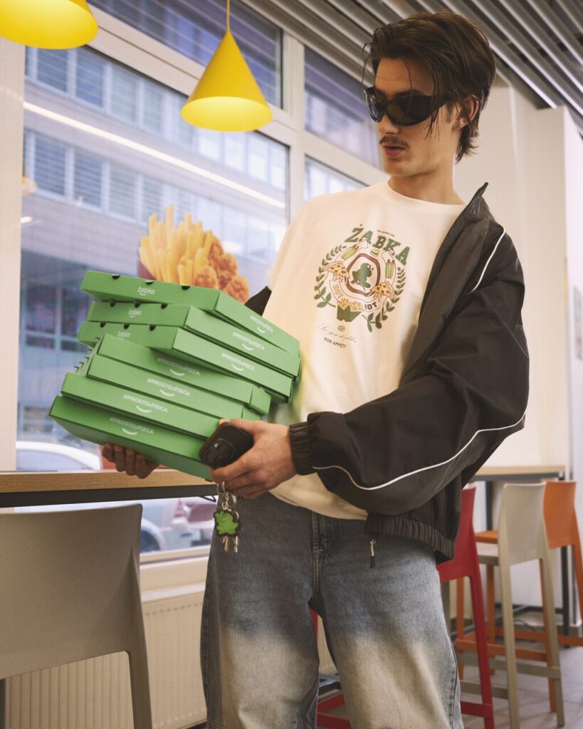 – W kolekcji dla Żabki zgłębiałam świat oferty ciepłych przekąsek, który połączyłam z lekkim i przyjemnym wakacyjnym vibem. Koszulki z projektem żabkowego logo są kolejnym elementem w budowaniu społeczności Żabki, nawiązują do stylu vintage oraz college. Wesołym uzupełnieniem są spodenki z nadrukiem szachownicy oraz „sprana” czapka z daszkiem i praktyczna zwijana torba. Całość tworzy zestaw idealny na letnie wojaże i wypady do Żabki – mówi projektantka Justyna Tasak.