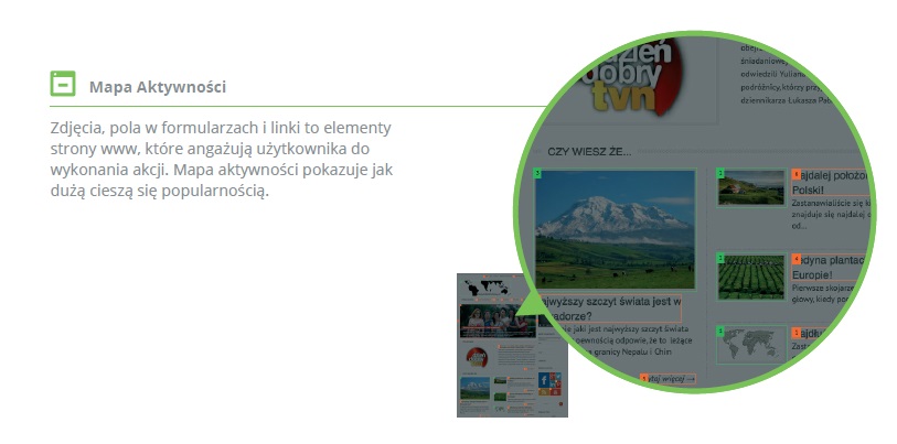 Mapa aktywności elementów dostarcza właścicielowi strony informacji o tym, ile razy użytkownicy klikali w obiekty takie jak formularze, pliki graficzne i linki. Dostarczone dane dają odpowiedź, czy przyciski były skutecznie użyte i czy cieszą się one zainteresowaniem. Analityka strony obejmuje również dane związane z tym w jaki sposób strona jest przewijana, czyli w której jej części użytkownik spędził najwięcej czasu. Raport scroll mapy wskazuje, czy ulokowanie CTA jest właściwe czy też w danej lokalizacji jest on słabo widoczny.