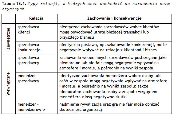 Dylematy etyczne charakterystyczne dla organizacji sprzedażowych pojawiają się w dwóch typach relacji: 1) relacjach zewnętrznych, tj. kontaktach reprezentantów firmy z klientami i konkurencją oraz 2) relacjach wewnętrznych, w tym, jak się do siebie odnoszą członkowie organizacji. Przykładowe dla tych typów relacji nieetyczne zachowania wraz z ich konsekwencjami zostały przedstawione w tabeli 13.1.