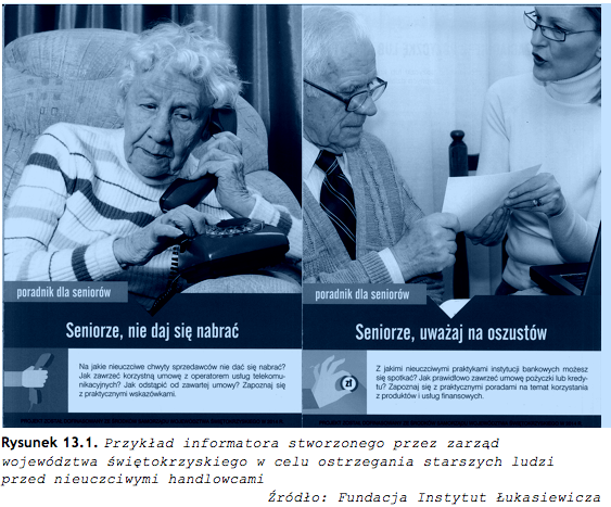 - podszywanie się pod przedstawicieli innych firm (częste w kanale D2D) — specyficzny przypadek kłamania i nielegalnego działania jednocześnie; patrz przykład informatora ostrzegającego starszych obywateli przed nieuczciwymi sprzedawcami na rysunku 13.1.