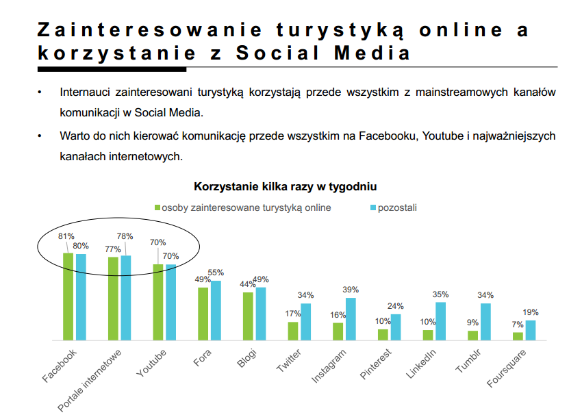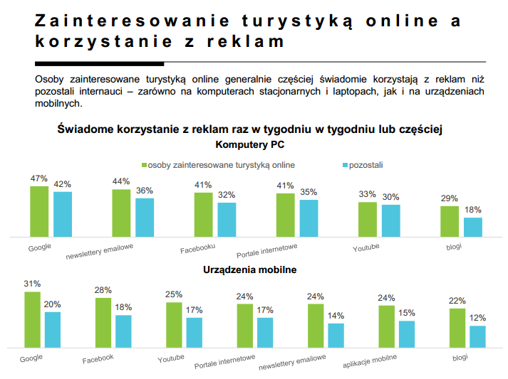 Dla branży turystycznej internet to przede wszystkim przestrzeń tradycyjnej reklamy – internauci zainteresowane wyjazdami nie są heavy-userami zaawansowanych kanałów social mediowych, takich jak Twitter czy Instagram. Najważniejszymi kanałami są dla nich: Facebook, Youtube i portale horyzontalne. Co ważne – te osoby najchętniej świadomie korzystają z reklam w Google (robią to częściej niż pozostali internauci). Najchętniej trafiają bezpośrednio na strony WWW sklepów – w tym przypadku – agencji turystycznych, skąd czerpią najważniejsze dla nich informacje (ale nie można też zapominać o porównywarkach cen – równie istotnych dla tej grupy internautów).
