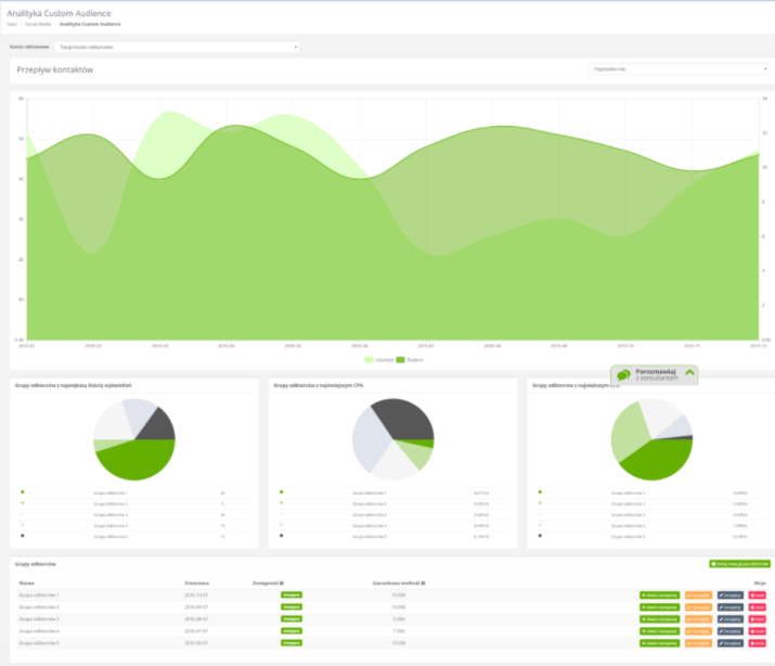 Obecne na rynku oprogramowania do automatyzacji marketingu pozwalają na wykorzystanie posiadanej bazy kontaktów w Facebook Ads i kampaniach Custom Audience, umożliwiając dokładniejsze, dynamiczne i zautomatyzowane określanie grupy odbiorców, z podziałem dla poszczególnych kont reklamowych. Określanie grupy odbiorców odbywa się na podstawie ich zachowania online oraz dokonywanych transakcji. System pozwala na automatyczne dodawanie i usuwanie konkretnych osób z określonych grup odbiorców, dzięki czemu całkowicie pomijamy kwestię ręcznego przygotowania list i wdrażania dodatkowych kodów.
