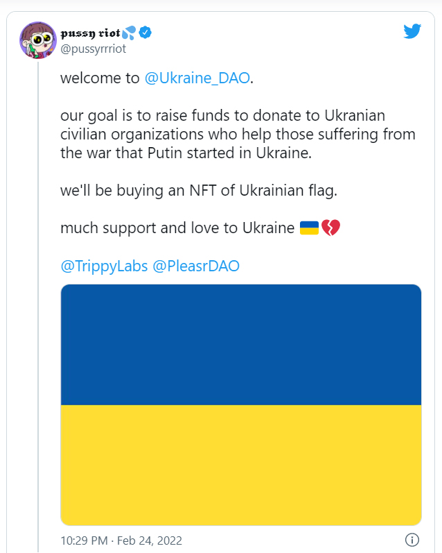 Nadieżda Tołokonnikowa, współzałożycielka znanej rosyjskiej grupy aktywistów Pussy Riot, we współpracy z Trippy Labs i PleasrDAO wystartowała z inicjatywą UkraineDAO.
