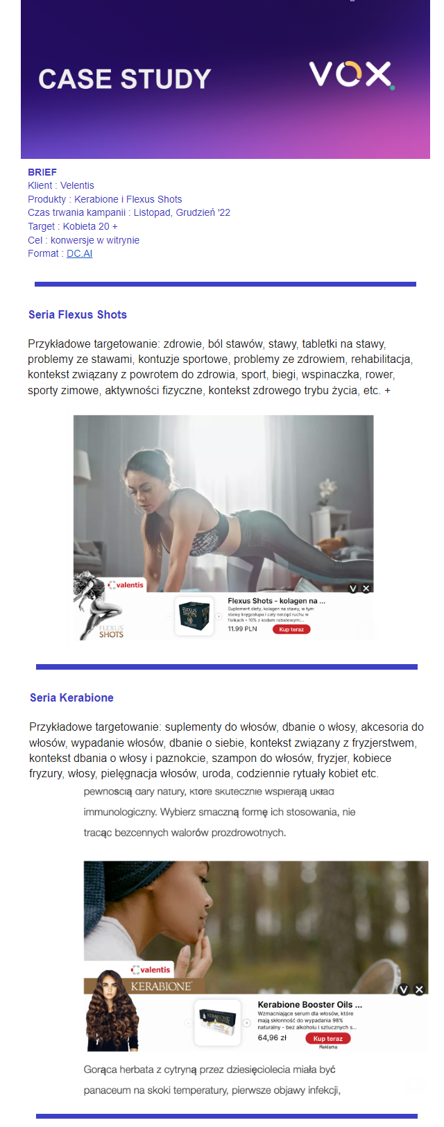 – Zdecydowaliśmy się na wypróbowanie nowatorskiego formatu DC.AI i zrealizowanie wspólnie z VOX kampanii ukierunkowanej na generowanie wysokiej jakości ruchu na stronie oraz sprzedaży, poprzez zautomatyzowane dobieranie produktów do konkretnych treści redakcyjnych w czasie rzeczywistym – mówi Eustachy Chmurko- head of digital marketing.
