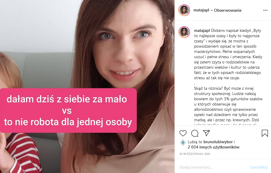 Na Instagramie doskonale odnalazły się ekspertki z blogosfery parentingowej, m.in. Magdalena Komsta @wymagajace_pl – 48,8 tys. i Alicja Kost @matajapl – 65,9 tys. Na profilu Matai można przeczytać: „Jestem głosem matek i wyzwalam z poczucia winy”. Autorka wykorzystuje mechanizmy Instagrama, by badać opinie odbiorców, a potem uświadamiać rodziców, jak wiele osób spotyka się z podobnymi problemami. Z komentarzy czytelników wynika, że jest to bardzo uwalniające doświadczenie.