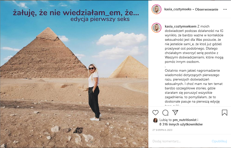 W świecie tych narzędzi doskonale funkcjonuje Katarzyna Koczułap, która swoją działalność rozpoczęła właśnie od Instagrama. Profil @kasia_coztymseksem w styczniu przełamał granicę 300 tys. obserwatorów.