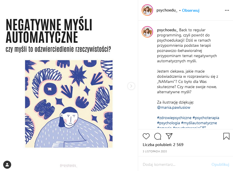 Rośnie grono osób, które za pośrednictwem Instagrama pomagają w rozumieniu i nazywaniu emocji, procesów rządzących naszymi mózgami i dbaniu o dobrostan psychiczny, a także normalizują temat psychoterapii, często na własnym przykładzie. Należą do niego m.in.: