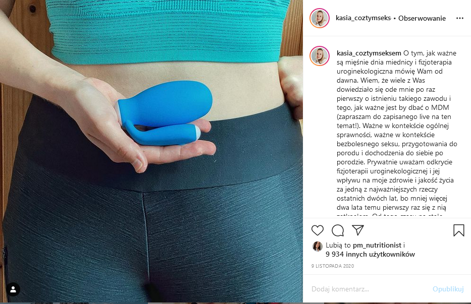 Marki z kategorii zdrowie mają szansę przebić się na Instagramie właśnie dzięki kompetencjom influencerów. Przykład komunikacji marki Pelvifly (urządzenia do ćwiczenia mięśni dnia miednicy) pokazuje, że stonowany i racjonalny przekaz również działa. Marka ma swój profil, bardzo estetyczny, na którym dominuje przekaz edukacyjny. Pojawiła się m.in. u @kasia_coztymseksem i @ania maluje, które tłumaczyły, jak działa urządzenie, jak go używać i informują o możliwości rozłożenia płatności na raty, ponieważ urządzenie jest dość drogie, jak na możliwości młodej użytkowniczki. Taka komunikacja wymaga od influencerek odpowiedniego przygotowania merytorycznego i gotowości do odpowiadania na pytania obserwatorów.