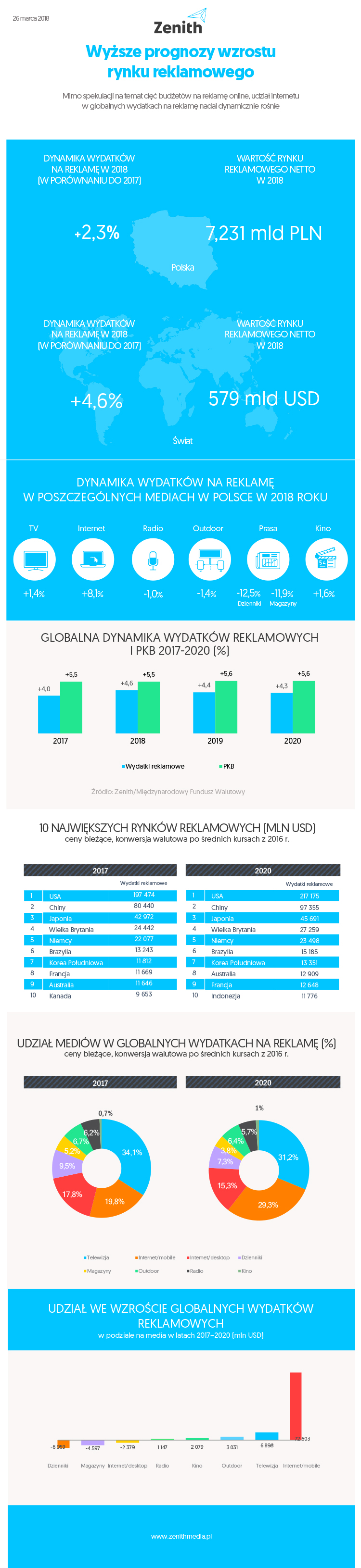 Rynek reklamowy w Polsce urośnie w tym roku o 2,3%, a wartość inwestycji w reklamę wyniesie na koniec roku 7,231 mld PLN netto − prognozuje agencja mediowa Zenith. Wyższe są także prognozy wzrostu dla globalnego rynku reklamowego – w tym roku wzrośnie o 4,6%, osiągając na koniec roku wartość 579 mld USD netto.